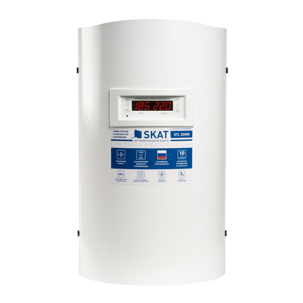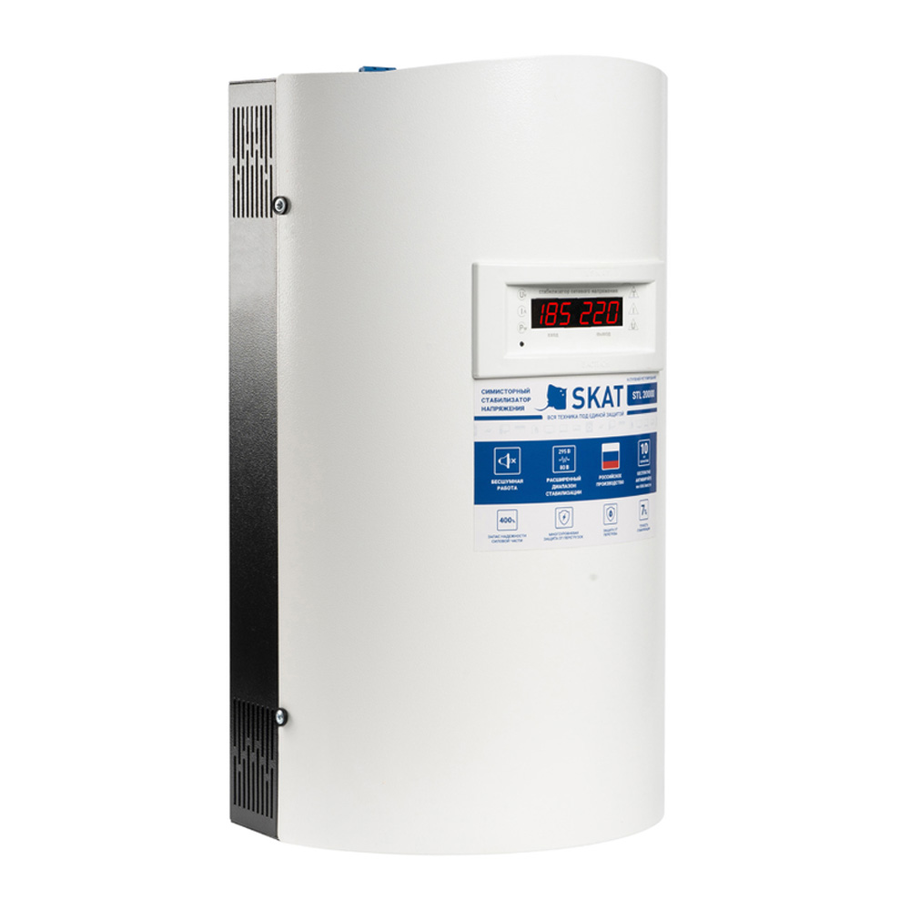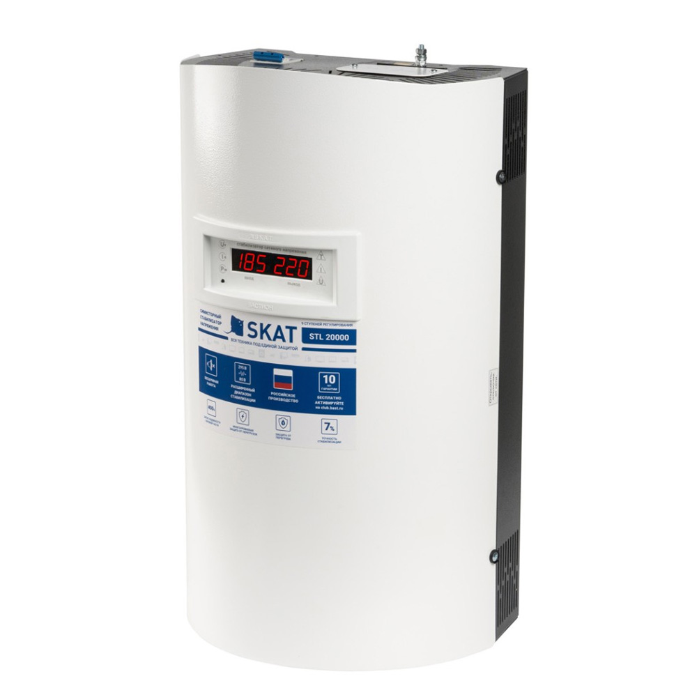 Стабилизатор напряжения СКАТ 784 Skat STL 20000 исп. Н предназначен для поддержания стабильного выходного напряжения и защиты бытовой техники от перепадов и провалов в электросети. Модель SKAT STL-20000 исп. Н выполнена на симисторных ключах управления, имеет цифровую индикацию и бесшумное переключение ступеней (естественное охлаждение без вентилятора). Поддерживается широкий диапазон стабилизации: в штатном режиме рабочий диапазон входного напряжения 120...280 В, а в расширенном режиме — предельный диапазон 80...295 В (с меньшей точностью стабилизации). Для повышения надежности предусмотрены защита от перегрева (4 температурных датчика), тройная защита от перегрузки и короткого замыкания, а также система самодиагностики с отображением причины аварийного отключения нагрузки.