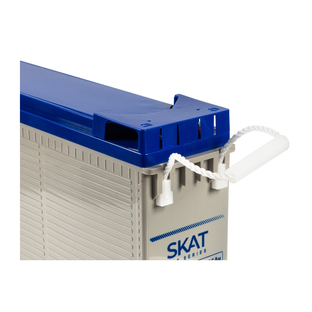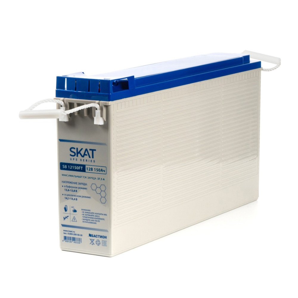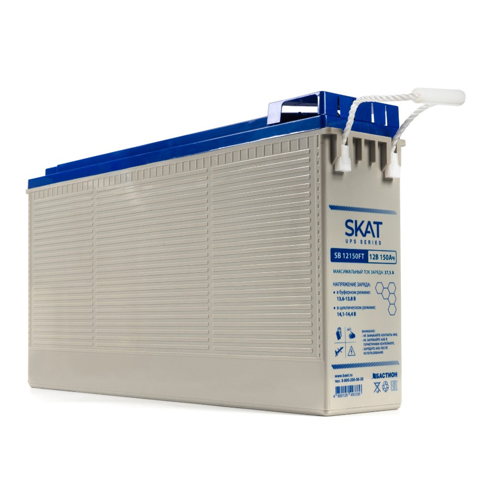 Аккумулятор герметичный свинцово-кислотный необслуживаемый СКАТ 8997 SKAT SB 12150FT — АКБ, выполненный по технологии AGM (Absorbent Glass Mat) с системой рекомбинации газов VRLA и предназначенный для использования в составе систем резервного питания. Серия SKAT SB FT имеет оптимизированную конструкцию корпуса для установки в телекоммуникационные стойки и шкафы 19" и 23", а фронтальное расположение клемм облегчает монтаж и обслуживание. Герметизация реализована с помощью клапана сброса избыточного давления, что помогает предотвратить деформацию корпуса. Аккумулятор рассчитан на применение в составе комплексов бесперебойного питания телекоммуникационного и серверного оборудования, систем связи, а также медицинского и промышленного оборудования большой мощности. Среди особенностей — повышенная токоотдача, низкий саморазряд (возможность хранения без подзаряда до 6 месяцев), возможность эксплуатации в любом положении (кроме вниз клеммами), а также заявленный увеличенный срок службы до 12 лет.