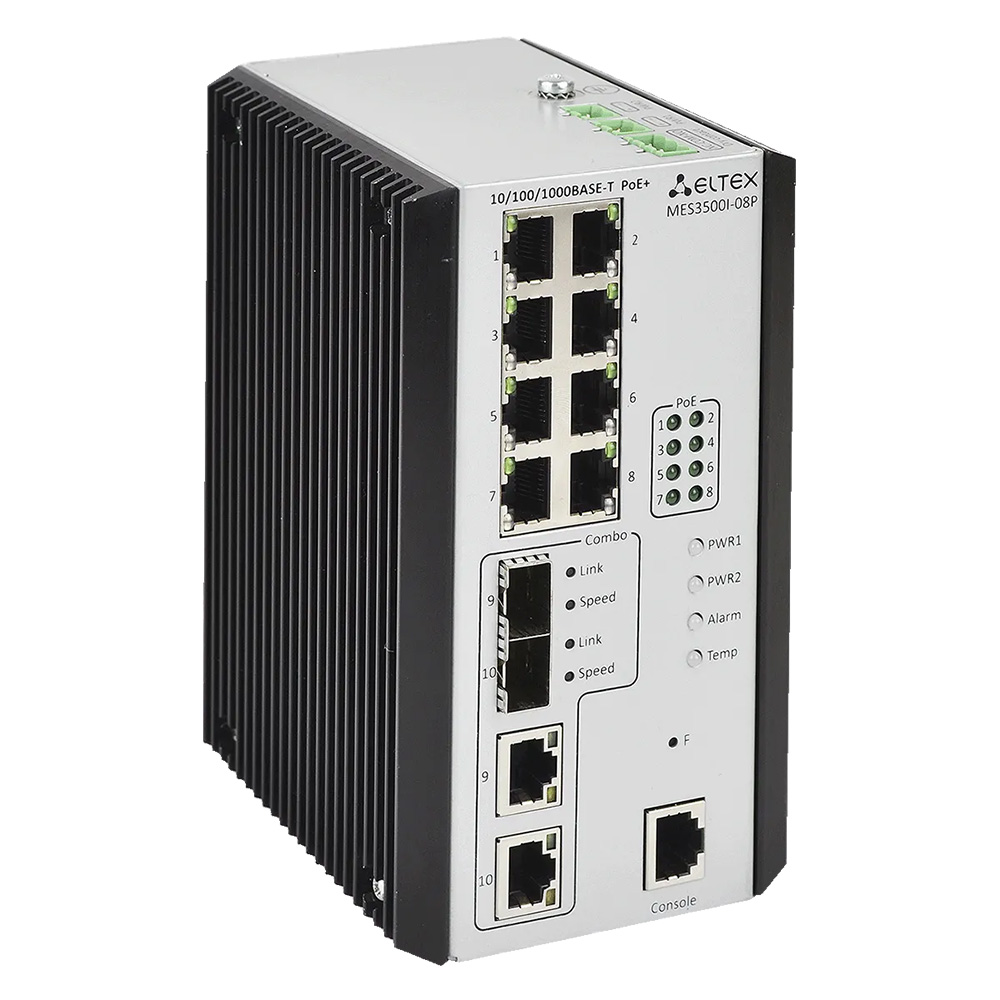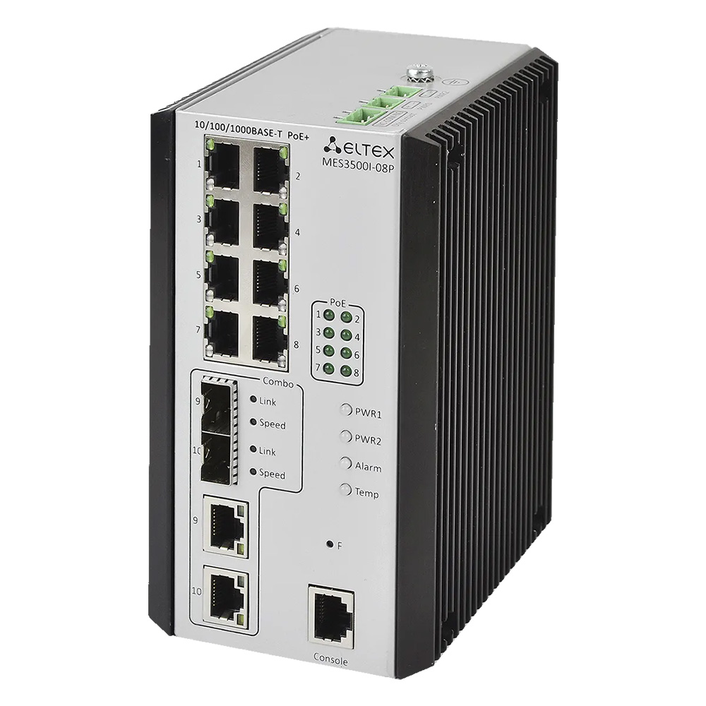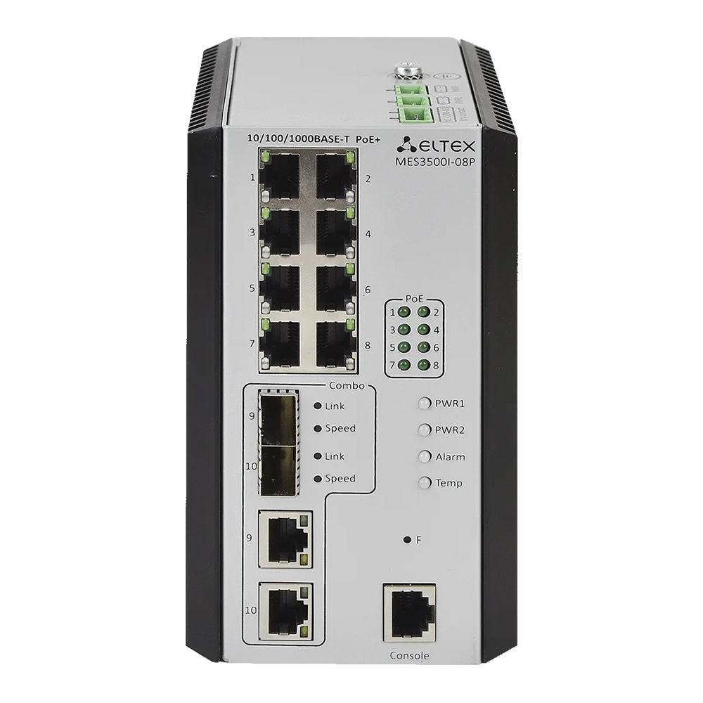 Промышленный коммутатор уровня L3 Eltex MES3500I-08P предназначен для построения отказоустойчивых сетей передачи данных на промышленных объектах, где требуется повышенная надежность и устойчивость к неблагоприятным воздействиям окружающей среды. Устройство оснащено 8 гигабитными портами 10/100/1000BASE-T с поддержкой PoE/PoE+ и двумя комбинированными портами 1G Combo (RJ-45/SFP), что позволяет подключать широкий спектр сетевых устройств и гибко расширять инфраструктуру. Коммутатор обеспечивает пропускную способность 20 Гбит/с, поддерживает таблицу MAC на 16384 адреса, до 4094 VLAN и аппаратные функции QoS с 8 очередями обслуживания на порт, что гарантирует стабильное качество связи. Корпус имеет степень защиты IP30, устройство работает в диапазоне температур от -40 до +70 °С и использует пассивное охлаждение. Поддерживается управление через облачный сервис Eltex Cloud Configuration Manager. MES3500I-08P сочетает высокую производительность, энергоэффективность и надежность для непрерывной работы в промышленных условиях.
