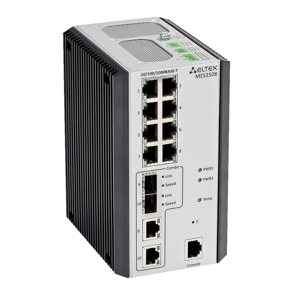 Промышленный коммутатор уровня L3 Eltex MES3508P предназначен для организации отказоустойчивых и защищённых сетей передачи данных на производственных и инфраструктурных объектах. Он обеспечивает высокую производительность на уровне 20 Гбит/с и оснащён восемью портами 10/100/1000BASE-T с поддержкой PoE/PoE+ и двумя комбо-портами RJ-45/SFP. Устройство функционирует при температуре от -40 до +70 °C, что делает его подходящим для использования в промышленных условиях. Коммутатор поддерживает управление через Eltex Cloud Configuration Manager, имеет таблицу MAC на 16384 адреса, 1,5 МБ буфера и 512 МБ оперативной памяти. Благодаря пассивному охлаждению и потреблению питания 45–57 В DC обеспечивается надёжная и бесшумная работа. Возможности QoS, VLAN и LAG обеспечивают гибкую настройку трафика и резервирование каналов. Коммутатор MES3508P — надёжное решение для построения современных промышленных IP-сетей с поддержкой PoE-устройств и расширенными функциями управления.