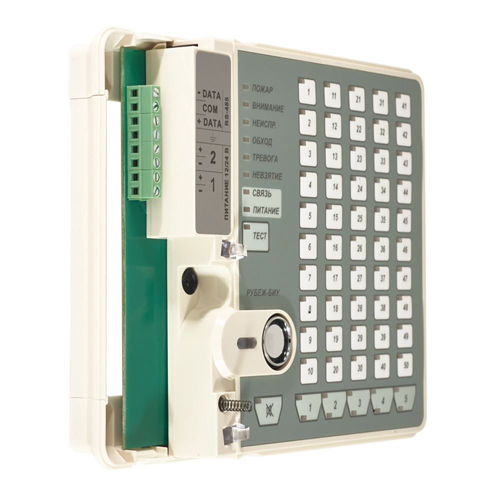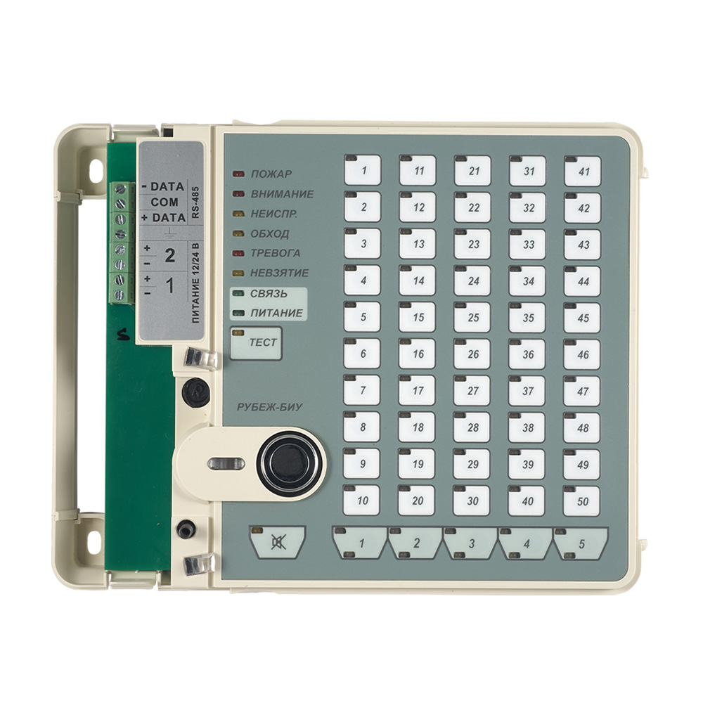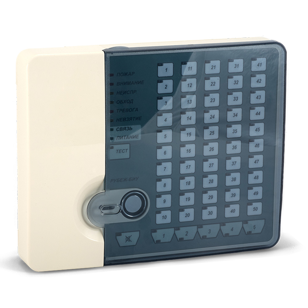 Блок индикации и управления Рубеж Рубеж-БИУ предназначен для визуального и звукового отображения состояния охранно-пожарных зон, исполнительных устройств и всей системы, а также для дистанционного управления ими. Прибор принимает сигналы от приемно-контрольных устройств по интерфейсу RS-485 и поддерживает обмен по линии длиной до 1000 м, одновременно контролируя до 250 зон и устройств. Информация распределяется по пяти страницам; каждая содержит 50 трёхцветных светодиодов, отражающих норму, пожар, внимание, неисправность и другие статусы. Дополнительные индикаторы показывают связь, питание, тест и отключение звука. События «Пожар», «Внимание» и «Тревога» сопровождаются звуковой индикацией с возможностью сброса кнопкой. Питание подаётся по двум вводам в диапазоне от 10 до 28 В, энергопотребление не превышает 7. Корпус соответствует IP20, рабочая температура от 0 до +55 °C. Конфигурирование выполняется через USB или RS-485 в ПО «FireSec 3 Администратор», а электронные ключи разграничивают доступ к функциям.