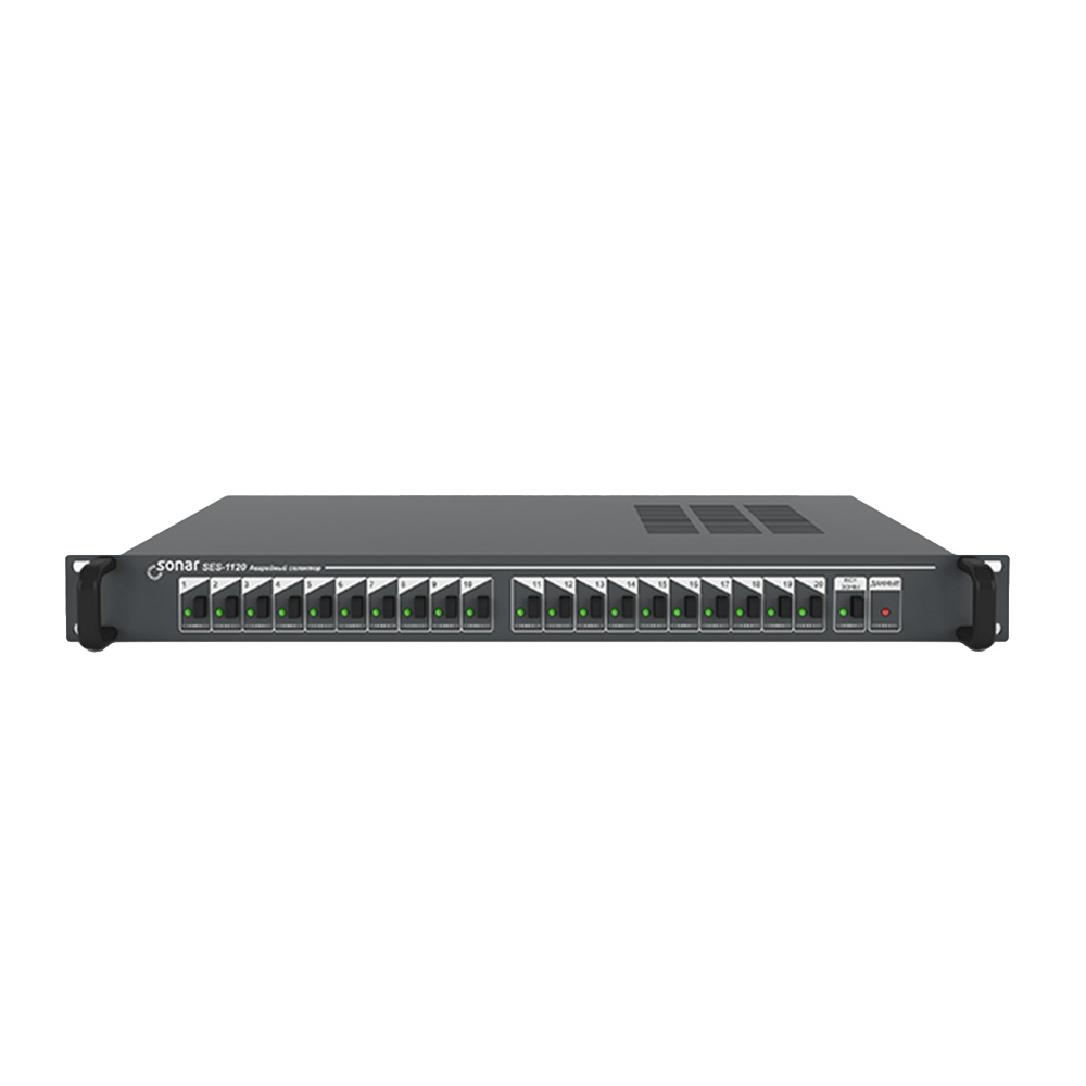 Sonar SES-1120 — аварийный селектор на 20 зон, предназначенный для ручного или автоматического переключения линий оповещения и тревожного вещания. Модуль собирает сигналы от 20 «сухих контактов» и, при активации, перенаправляет их на соответствующие зоны, обеспечивая адресную передачу тревожных сообщений или фоновой трансляции. Стоечное исполнение 1U упрощает монтаж в 19″ шкафу, а компактная глубина 200 мм экономит место в стойке. Аппарат питается от источника 24 В DC, что облегчает интеграцию с резервированными блоками питания и аккумуляторами. При подключении к сети 220 В он потребляет всего 3.5 Вт, что снижает тепловыделение и эксплуатационные расходы. Металлический корпус весом 3 кг обеспечивает механическую прочность и электромагнитную защиту. Sonar SES-1120 относится к базовым блокам линейки Sonar и может использоваться как самостоятельное устройство или в составе комплексных систем оповещения, где требуется надёжная и быстрая коммутация до 20 зон. Устройство поставляется в готовой к эксплуатации конфигурации и не требует сложной настройки.