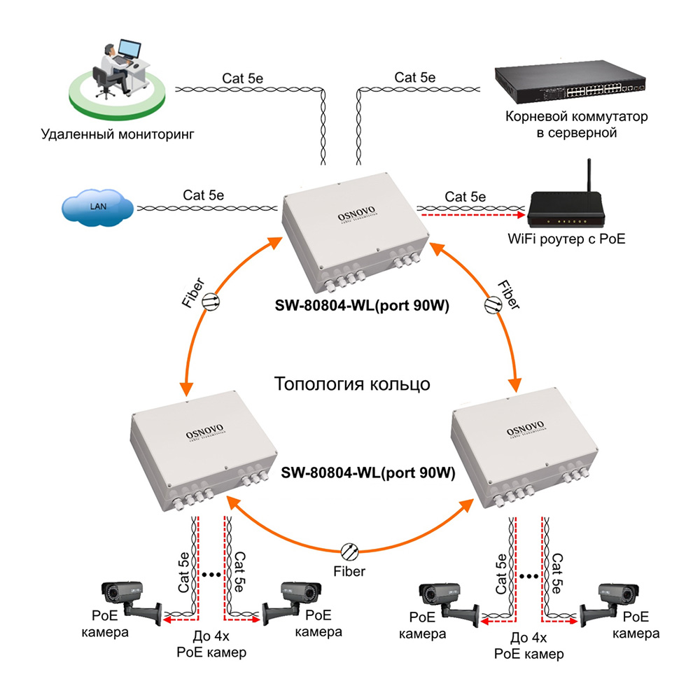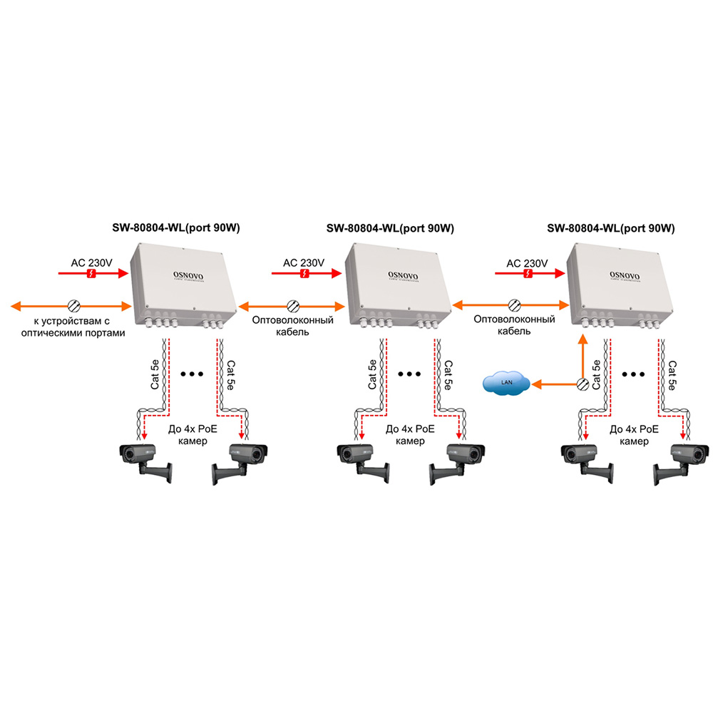Уличный управляемый (L2+) PoE-коммутатор Osnovo SW-80402-WL(port 90W) предназначен для организации сетей видеонаблюдения и передачи данных в условиях внешней среды. Устройство оснащено четырьмя гигабитными портами 10/100/1000Base-T с поддержкой PoE до 90 Вт и двумя SFP портами 1000Base-X для оптических подключений. Общий бюджет PoE достигает 240 Вт, что позволяет питать мощные IP-камеры и другое сетевое оборудование. Коммутатор соответствует стандартам IEEE 802.3af/at/bt и обеспечивает интеллектуальное управление питанием с функцией антизависания PoE-устройств. Корпус из поликарбоната с классом защиты IP66 гарантирует устойчивость к влаге, пыли и температурным колебаниям от -40 до +50 °C. Встроенная грозозащита и комплект поставки с оптической розеткой и пигтейлами обеспечивают полную готовность к монтажу. Управление возможно через Web-интерфейс, CLI, Telnet или SNMP, поддерживаются L2+ функции, VLAN, QoS и протоколы безопасности IEEE 802.1X. Этот коммутатор оптимален для наружных систем видеонаблюдения, уличных сетевых решений и промышленных объектов.