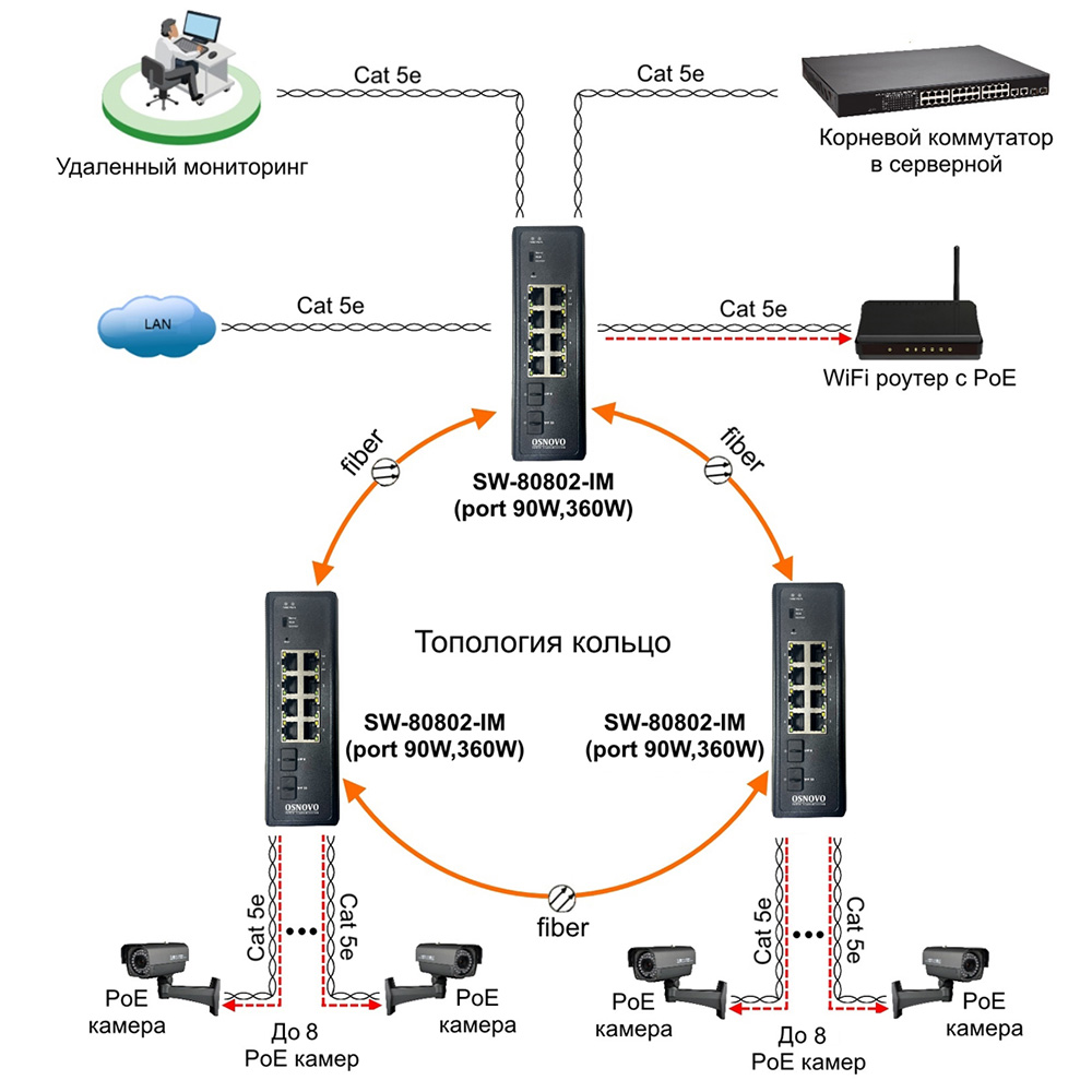 Промышленный управляемый PoE-коммутатор Gigabit Ethernet на 10 портов Osnovo SW-80802-IM разработан для обеспечения стабильного сетевого соединения и питания устройств в сложных промышленных условиях. Коммутатор оснащён 8 портами Gigabit Ethernet с поддержкой PoE, включая два порта PoE++ до 90 Вт, что позволяет использовать его с мощными IPкамерами, точками доступа и другими устройствами. Общая мощность PoE достигает 360 Вт. Устройство поддерживает протоколы IEEE 802.3af/at/bt, управление через Webинтерфейс, функции STP/RSTP, VLAN, LACP и PoE Autochecking. Реализован контроль температуры, влажности и напряжения, встроена грозозащита 6 кВ и электростатическая защита 8 кВ. Коммутатор имеет защиту IP40, питание 2× DC 48–57 В с резервированием, допускает работу при температуре −40...+75 °C, что делает его надёжным решением для промышленных объектов, систем видеонаблюдения и распределённых сетей.