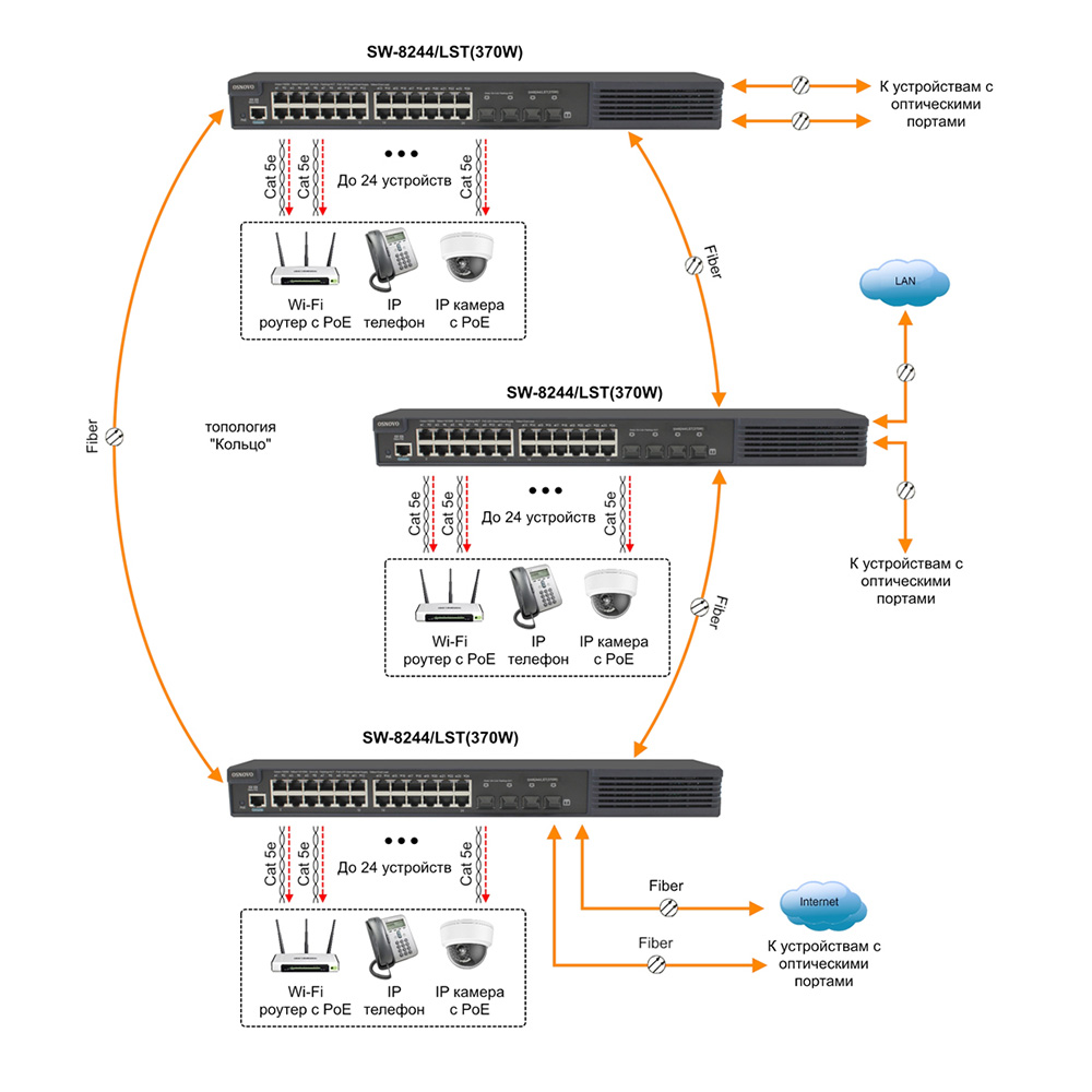 Управляемый L2+ стекируемый PoE-коммутатор Gigabit Ethernet Osnovo SW-8244/LST(370W) разработан для построения надежных и масштабируемых сетей с поддержкой питания PoE. Коммутатор оснащён 24 портами Gigabit Ethernet 10/100/1000BaseT с поддержкой PoE до 60 Вт на порт и четырьмя SFPпортами для аплинков. Общая мощность PoE достигает 370 Вт, что позволяет подключать оборудование с высоким энергопотреблением, включая IPкамеры и точки доступа. Устройство поддерживает стандарты IEEE 802.3af/at/bt, стекфункционал через SFPпорты и грозозащиту до 6 кВ на каждом медном порту. Коммутатор обеспечивает пропускную способность 256 Гбит/с и скорость обработки пакетов до 96 Mpps, поддерживает Jumbo Frame до 9 КБ и VLAN всех типов, включая QinQ. Благодаря сочетанию функций L2 и L3 — STP, RSTP, MSTP, OSPF, RIP, QoS и ACL — устройство подходит для корпоративных и инфраструктурных сетей. В комплект входит крепление для установки в 19дюймовую стойку. Встроенный БП, активное охлаждение и рабочая температура от 0 до +50 °C гарантируют стабильную работу в сложных условиях эксплуатации.
