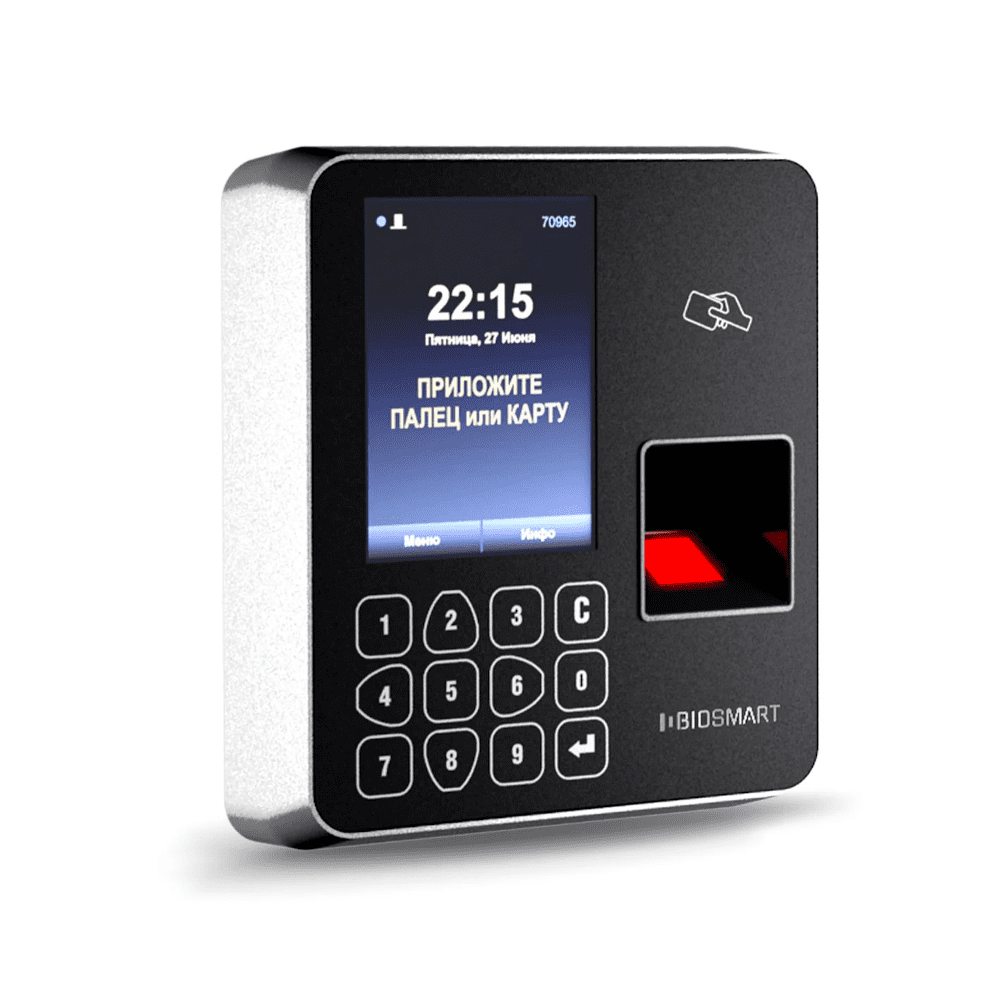 Терминал доступа BioSmart WTC2-MFR оборудован дисплеем и клавиатурой, оптическим сканером отпечатка пальца, мультиформатным (Mifare, EM-Marin, ISOProx II) считывателем карт. Поддерживает NFC.