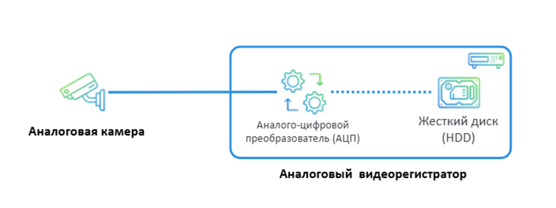 Для работы аналогового оборудования необходимы низкочастотные телесигналы, передаваемые по коаксиальному кабелю. Для работы цифровых видеокамер требуется сеть Ethernet или Wi-Fi. Объектив аналоговой камеры делает съемку изображения, которое по кабелю поступает на видеорегистратор, подключенный к монитору. Полученные данные записываются на жесткий диск, откуда делается вывод на экран. Для отправки видео в сеть или на телефон необходим перевод аналогового сигнала в цифровой.