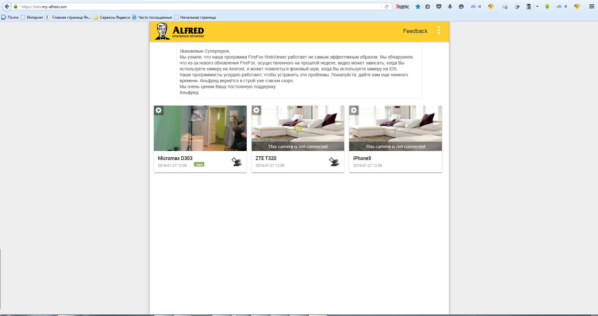 В случае использования гаджета в качестве монитора в приложении отобразятся подключенные под одним аккаунтом камеры. Для просмотра камер можно использовать веб-браузер Firefox.