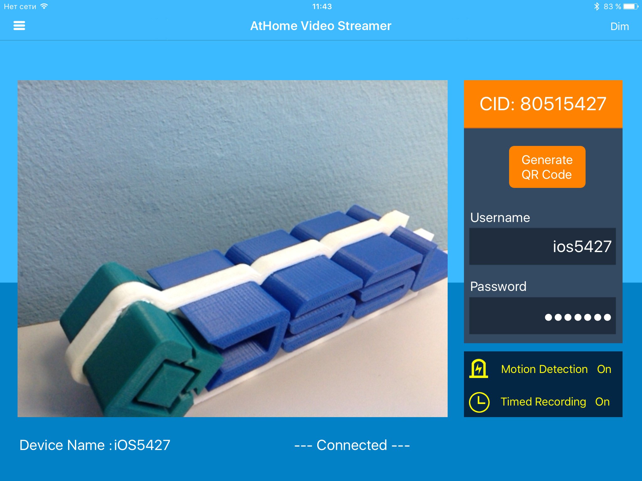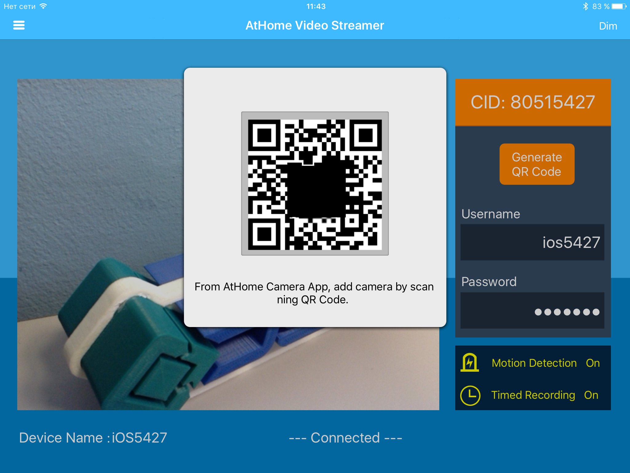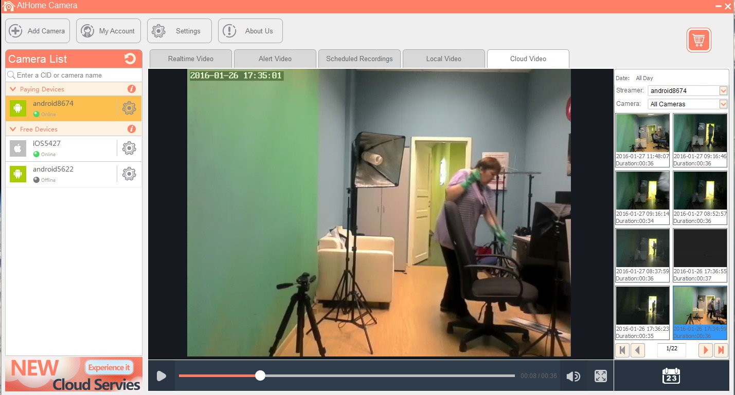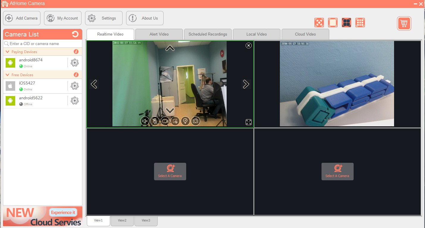 Для подключения смартфона потребуется зарегистрировать личный аккаунт, к которому будут подключаться все камеры. При запуске приложения ATHome video streamer гаджет перейдёт в режим видеокамеры. Ему будет присвоен индивидуальный номер CID, имя устройства и его пароль, который производитель рекомендует сменить на личный.