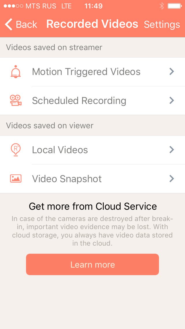 Приложение в режиме камеры настраивает детектор движения, используя 1 из 3 режимов чувствительности. После срабатывания детектора движения видео записывается на собственное «облако».