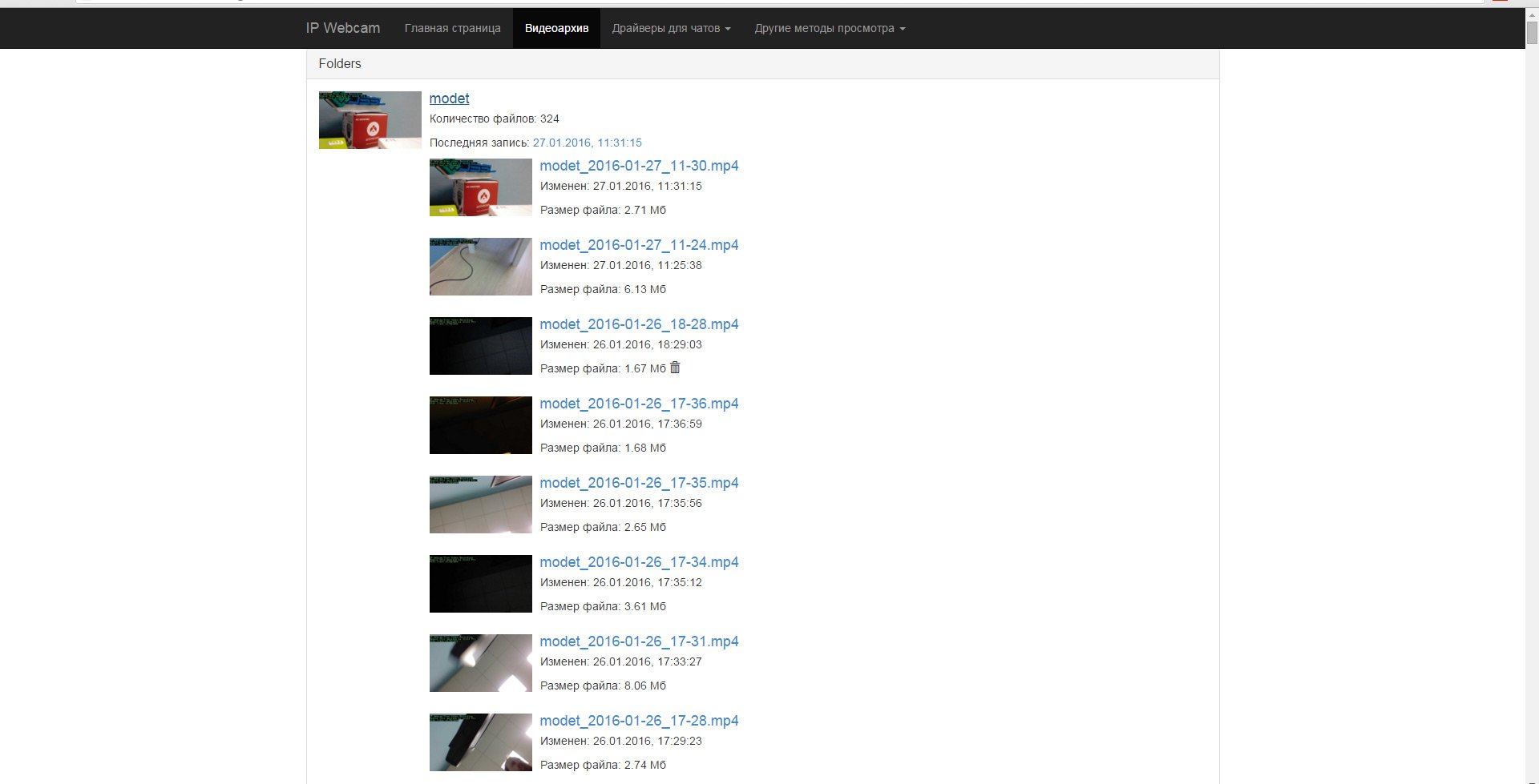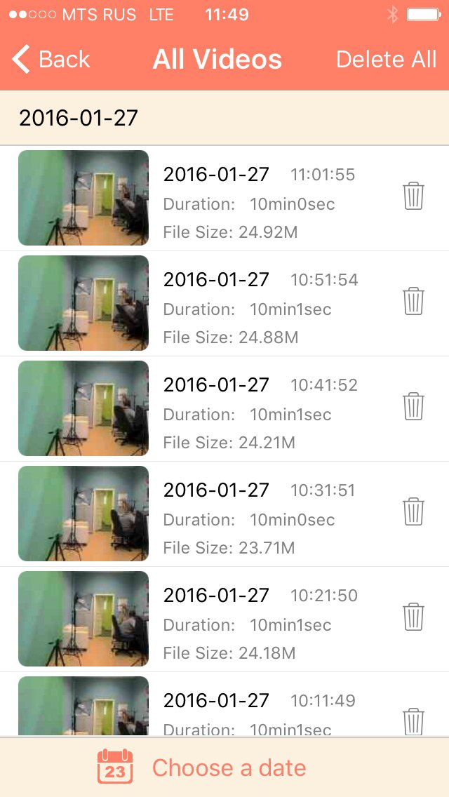 - Просмотр тревожных событий, записанных на саму камеру-смартфон. Длительность видеороликов – 35 секунд.