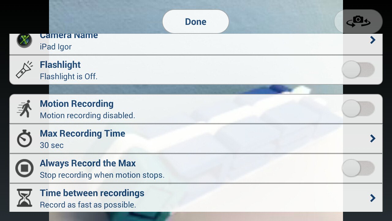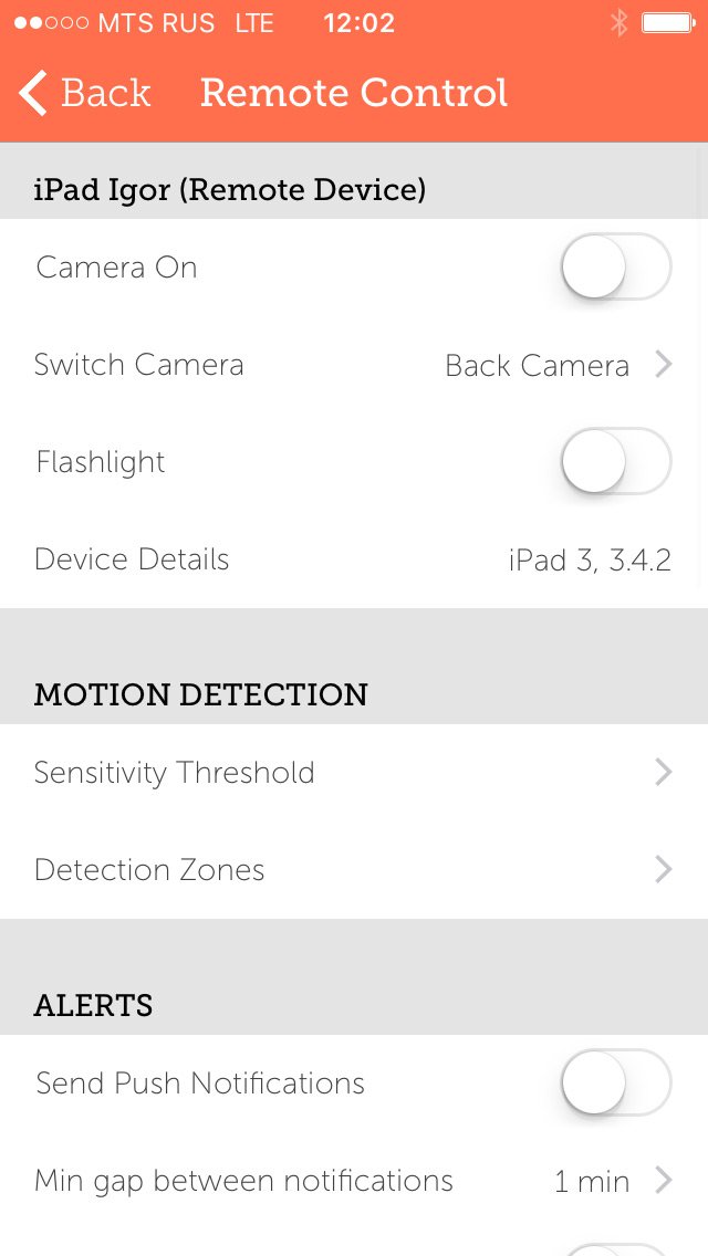 Приложение позволяет настраивать детектор движения (ползунок): его размеры, длину (максимум минута) и интервал, через который будет возможна следующая запись. Все настройки камеры доступны на гаджете, выступающим в роли монитора.