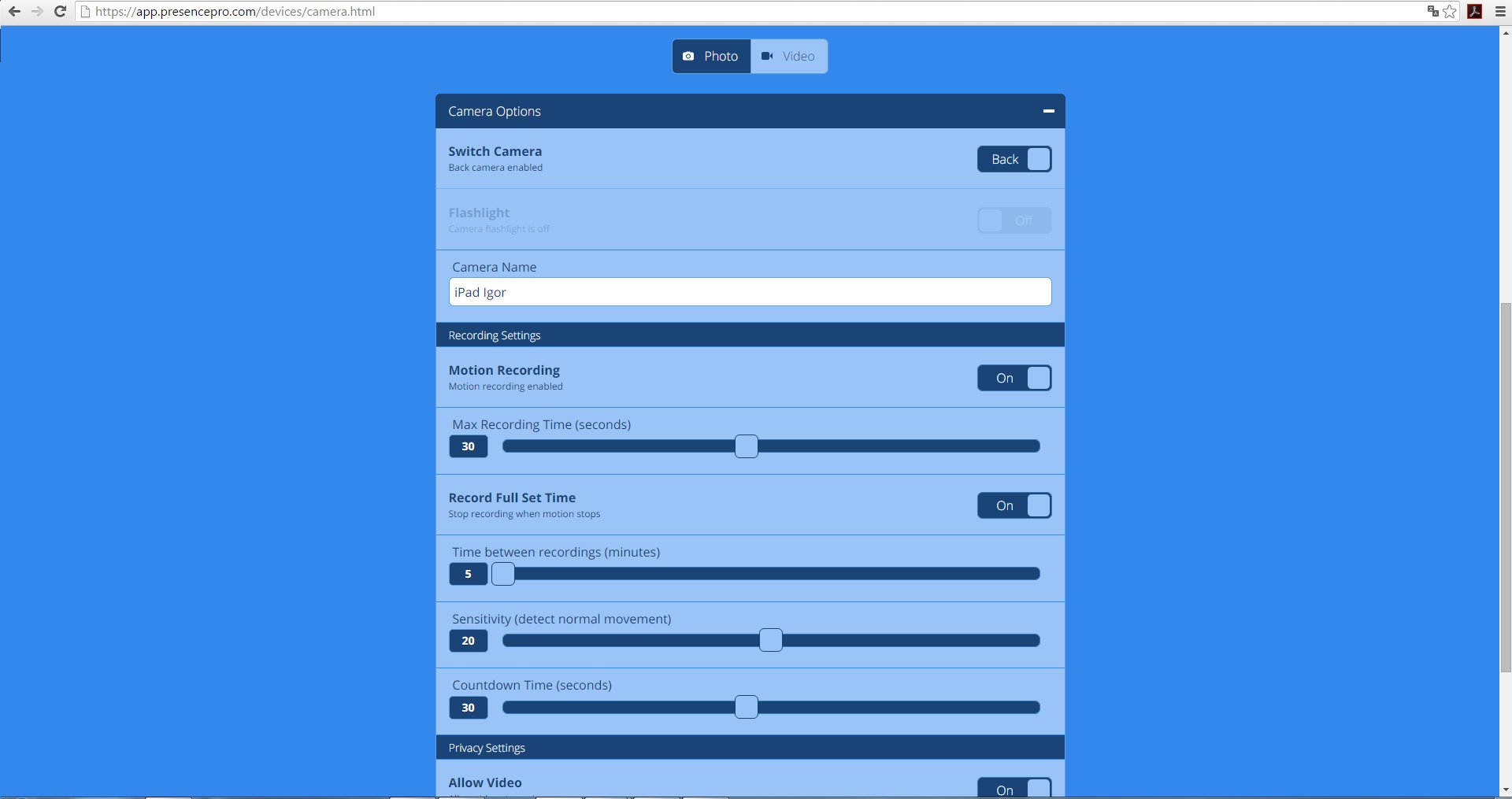 Приложение имеет множество настроек: детектор движения, который не только выбирает уровень чувствительности, но и определят область детектирования. Есть настройка видео и фото.