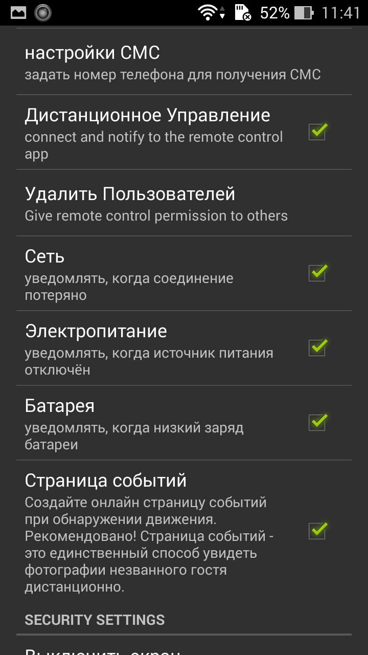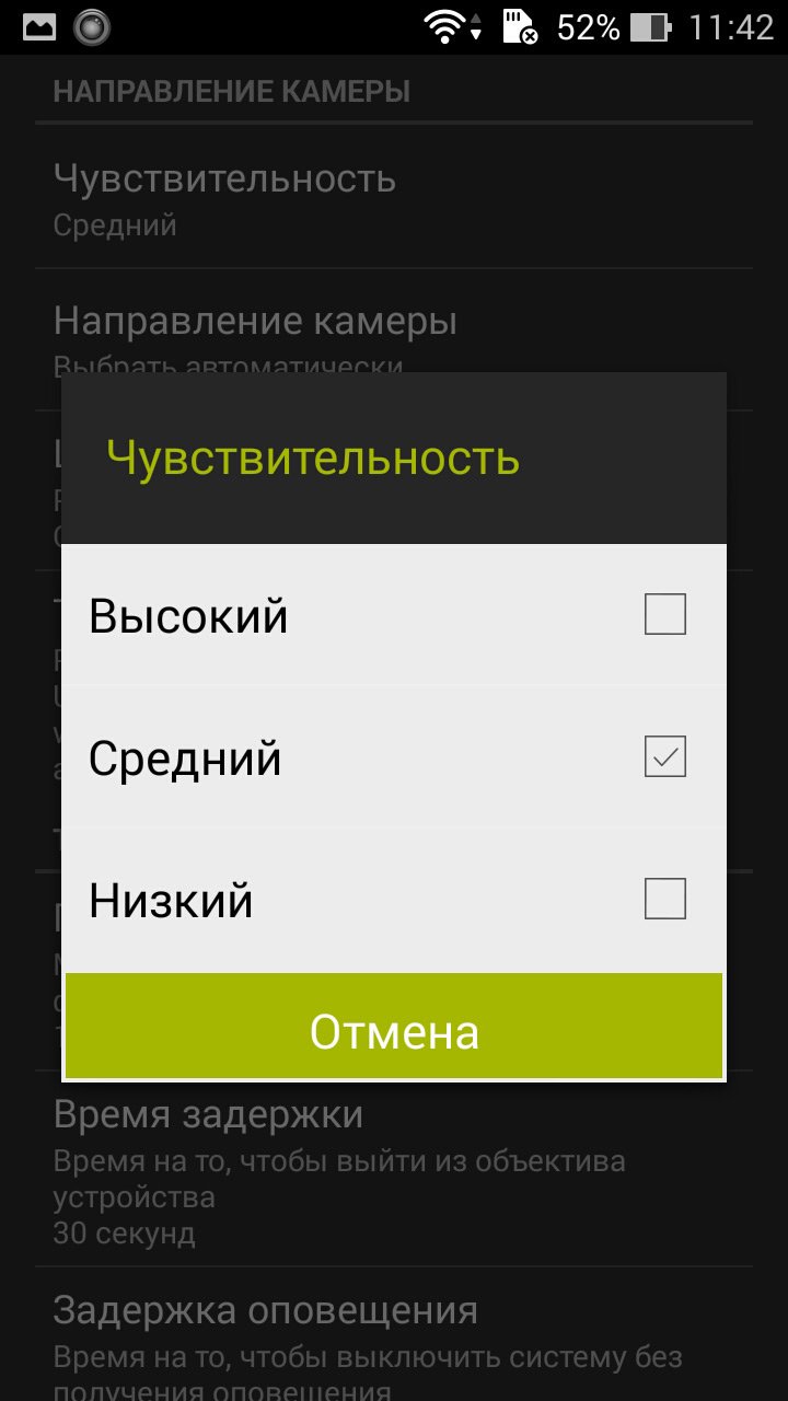 При запуске приложения пользователь попадает в меню настроек. Рекомендуется сразу включить детектор движения. Он имеет настройки чувствительности, расположенные в интервале от 0 до 250 единиц.