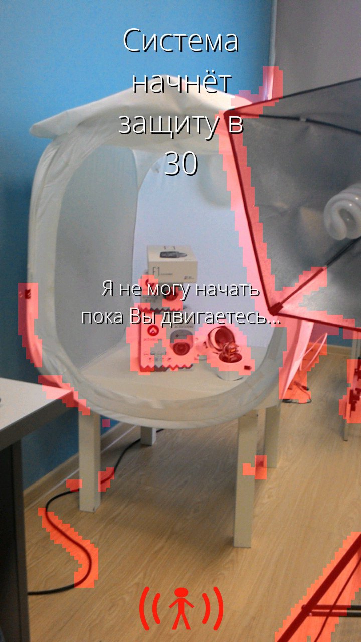 Далее нажатием большой кнопки посередине пользователь вводит пароль и камера встает на охрану.