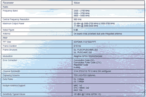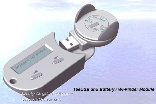 Поддерживаются спецификации Mobile WIMAX System Profile, в том числе MIMO (multiple-input multiple-output), смарт-антенны и режимы Idle, Sleep, Handover. Крохотное устройство 16eUSB поддерживает все ключевые диапазоны формата, в том числе 2,3 – 2,4 ГГц, 2,5 – 2,7 ГГц, 3,3 – 3,7 ГГц, 4,9 – 5,4 ГГц. Фактически в габаритах 16eUSB – 36 х 55 х 25 мм, присутствует всё необходимое для подключения, скажем, ноутбука, к скоростным каналам Mobile WIMAX во всём мире и обмена данными со скоростью до 9 Мбит/с на приём и до 2 Мбит/с на передачу при максимальном энергопотреблении не более 1,2 Вт.