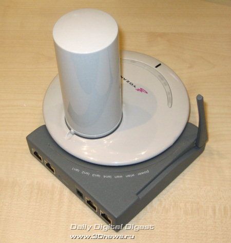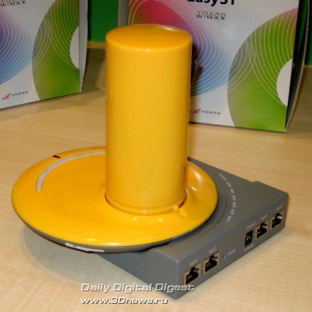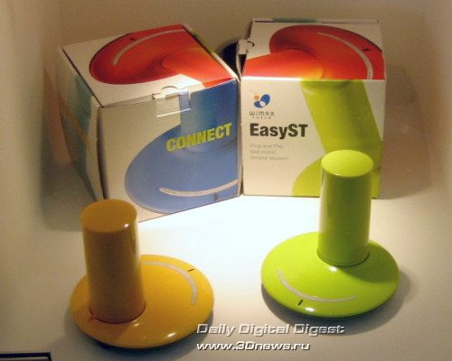 Представьте себе, что вот эта штуковина под названием EasyST размером всего лишь с чайное блюдечко, представляет собой полноценный "самоинсталлируемый" беспроводной модем для конечного пользователя, при этом подключение компьютера пользователя к интернет занимает меньше минуты! Модем EasyST выполнен на базе чипсета Intel 802.16 ProWireless 5116, ранее носившим рабочее название Rosedale, обладает встроенным интегрированным считывателем SIM-карт и всенаправленной антенной с усилением 2 дБ. Также модем комплектуется небольшой универсальной антенной - на фото это как раз тот самый "стакан" на блюдечке модема, с усилением 7 дБ, и автоматическим переключением рабочих секторов диаграммы направленности 4 x 90º.