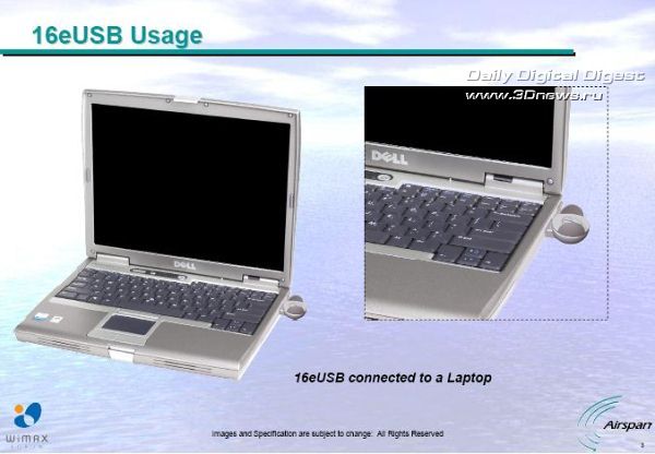 Прежде всего стоит сказать, что Airspan в дни CeBIT 2006 анонсировала своё первое мобильное устройство в серии продуктов AS.MAX и представила спецификации этой новинки под названием 16eUSB. Устройство обладает крохотными размерами – примерно с USB-флэшку или USB-плеер, при этом полностью совместимо со стандартом IEEE 802.16e-2005.