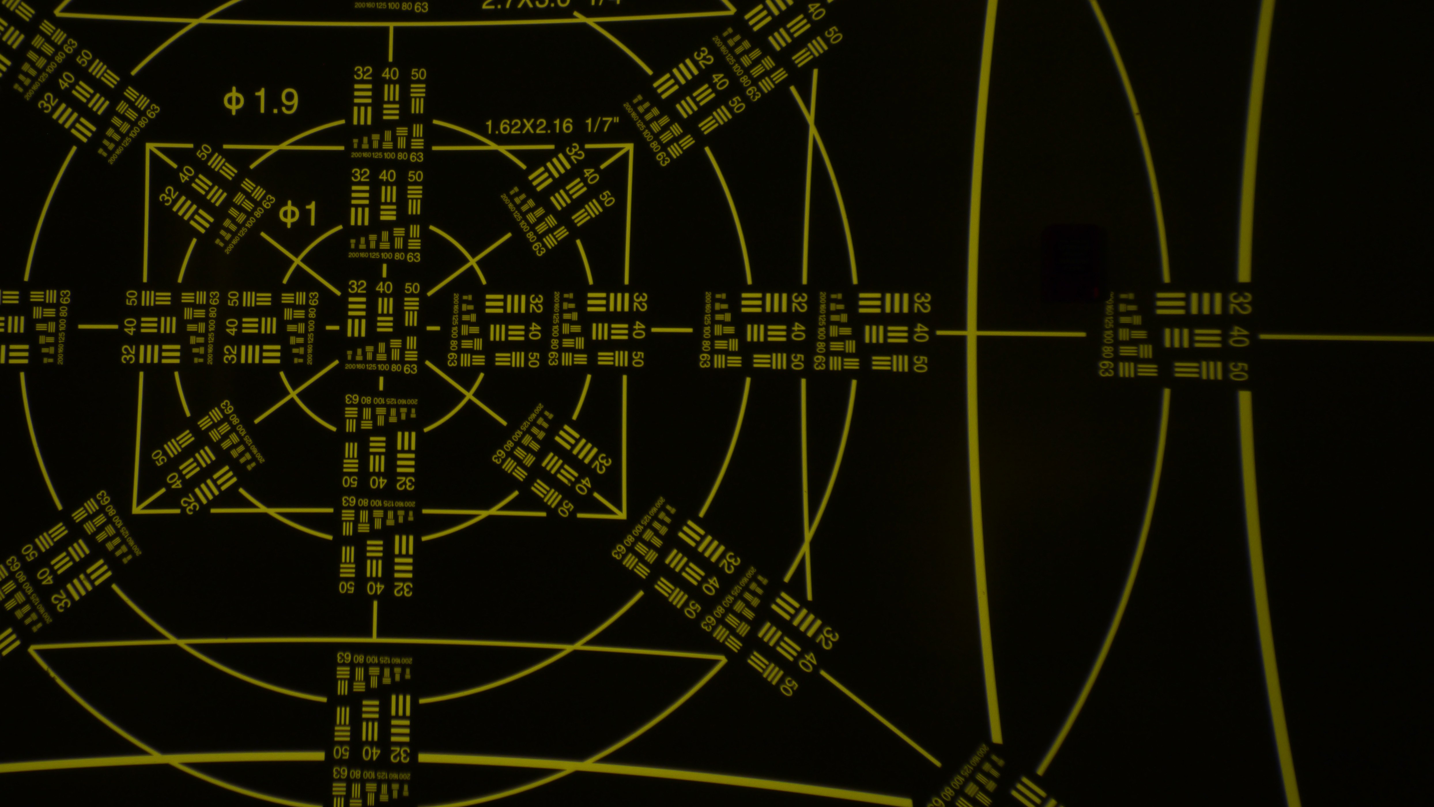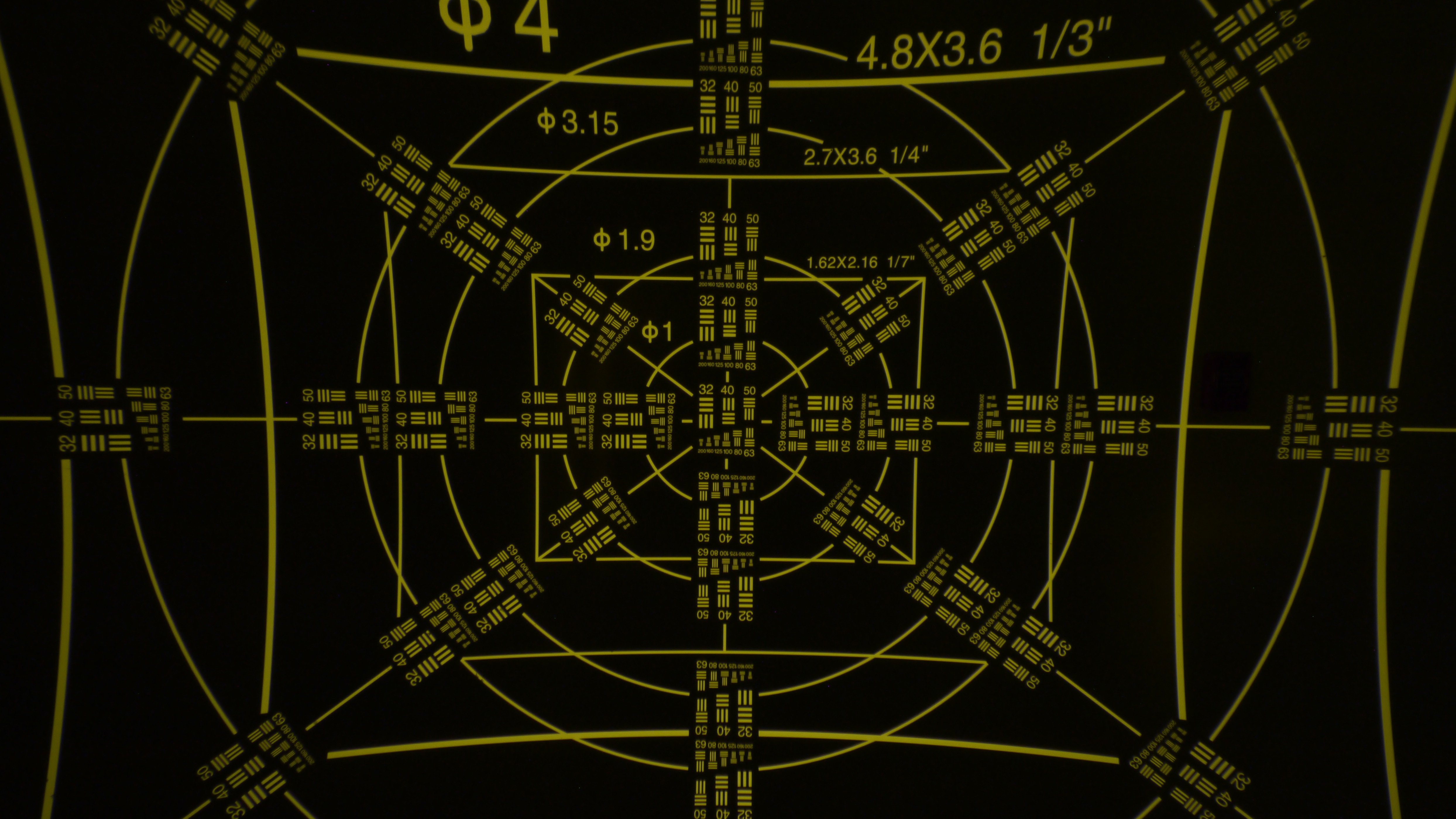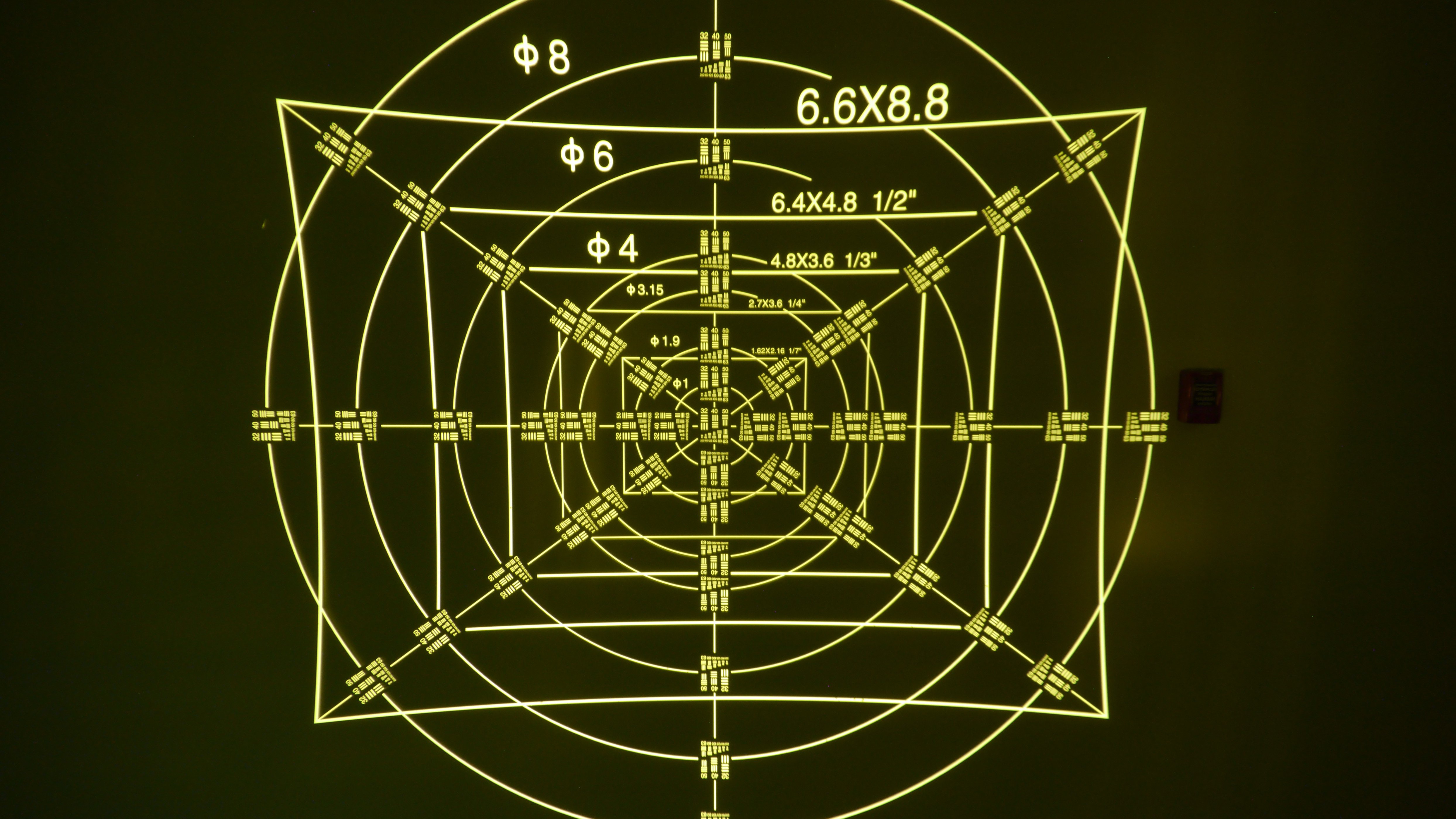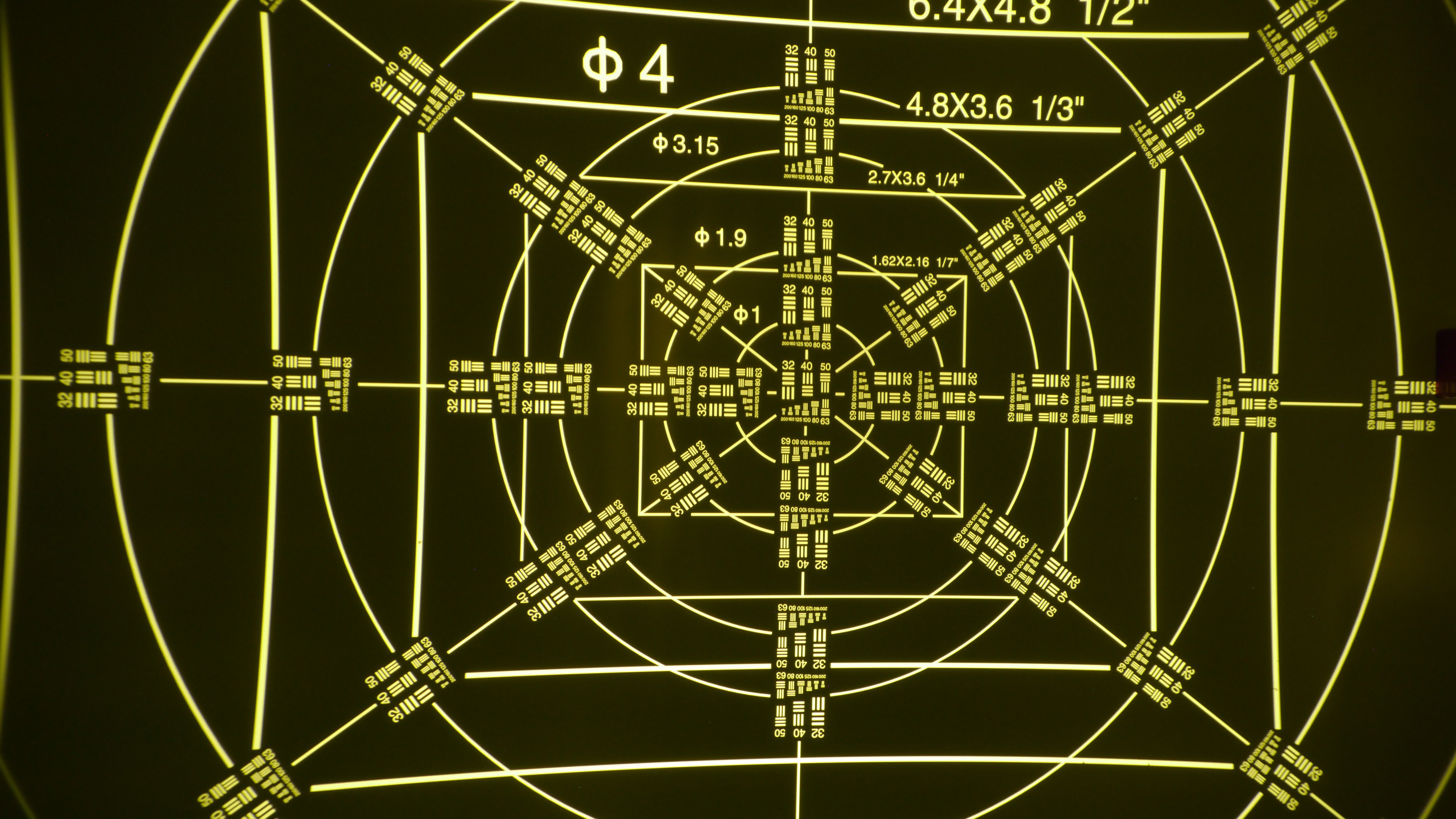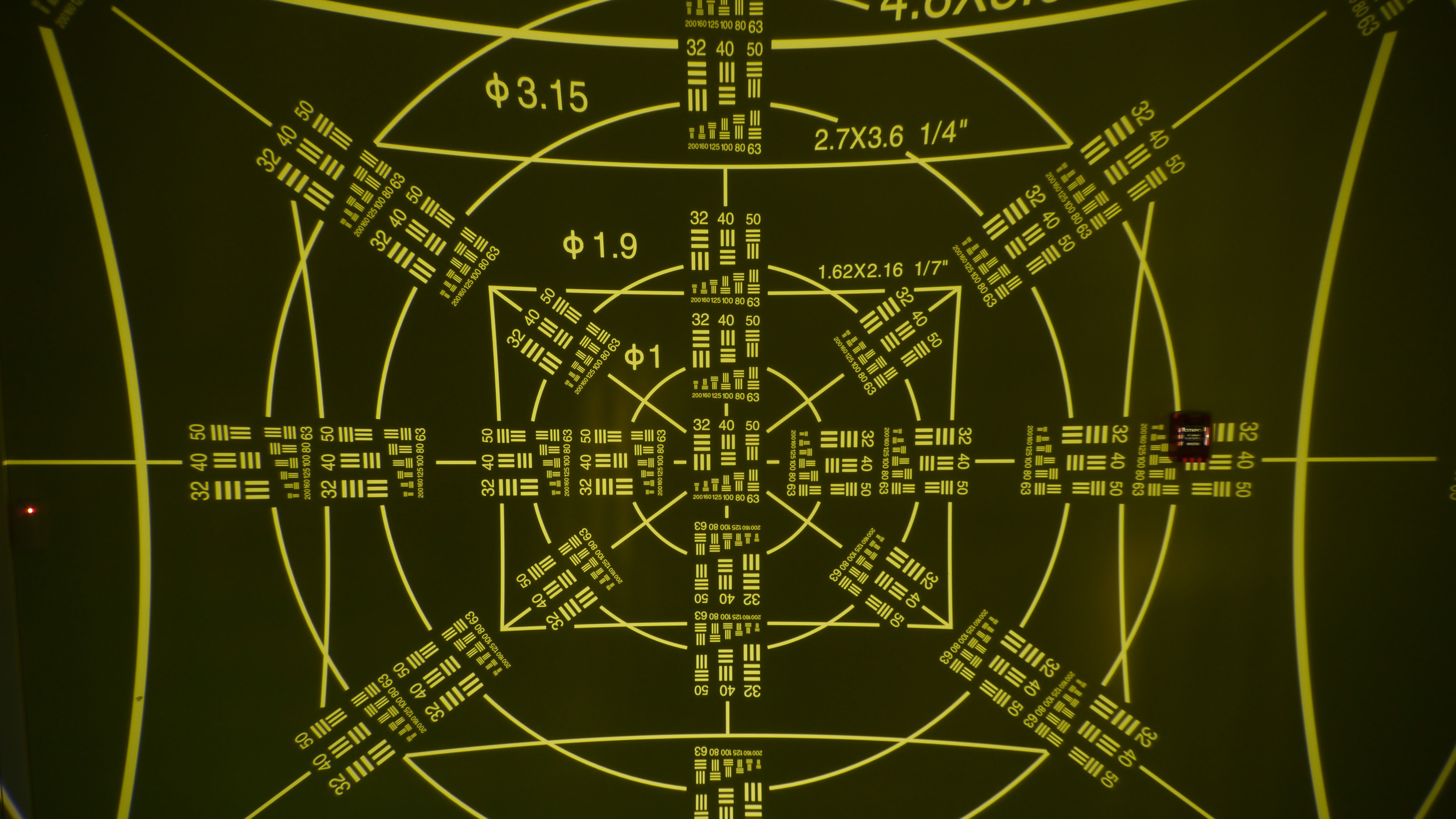 Разрешающая способность проектора составляет 200 Ip/mm (линий на миллиметр), таким образом на данном проекторе возможно протестировать объективы с максимальной разрешающей способностью до 44,23 мегапикселя для объективов рассчитанных на матрицы до 1 дюйма. Принцип его действия прост: объектив устанавливается через необходимый переходник (кольцо), подключается любая видеокамера с закрытым сенсором, если необходимо управление диафрагмой (все измерения проводим при максимально открытой диафрагме). Прибор проецирует таблицу через объектив на экран испытательную таблицу. Фокусировка и изменение фокусного расстояния производится так же, как обычно это делается на камере. Таблица имеет распределенные по полю линии разного размера и расстояния между ними с помощью которых и производится измерение разрешающей способности, которая вычисляется по формуле P=4D²*L*W, где P – количество пикселей, D — максимально-различимое число линий, L- ширина сенсора, W - высота сенсора. Размер матрицы мы берем из заявленных поставщиком данных, впрочем это легко проверяется по таблице, по которой, кроме этих двух параметров (разрешение и размер сенсора), можно еще замерить геометрические искажения вносимые оптикой и аберрации.