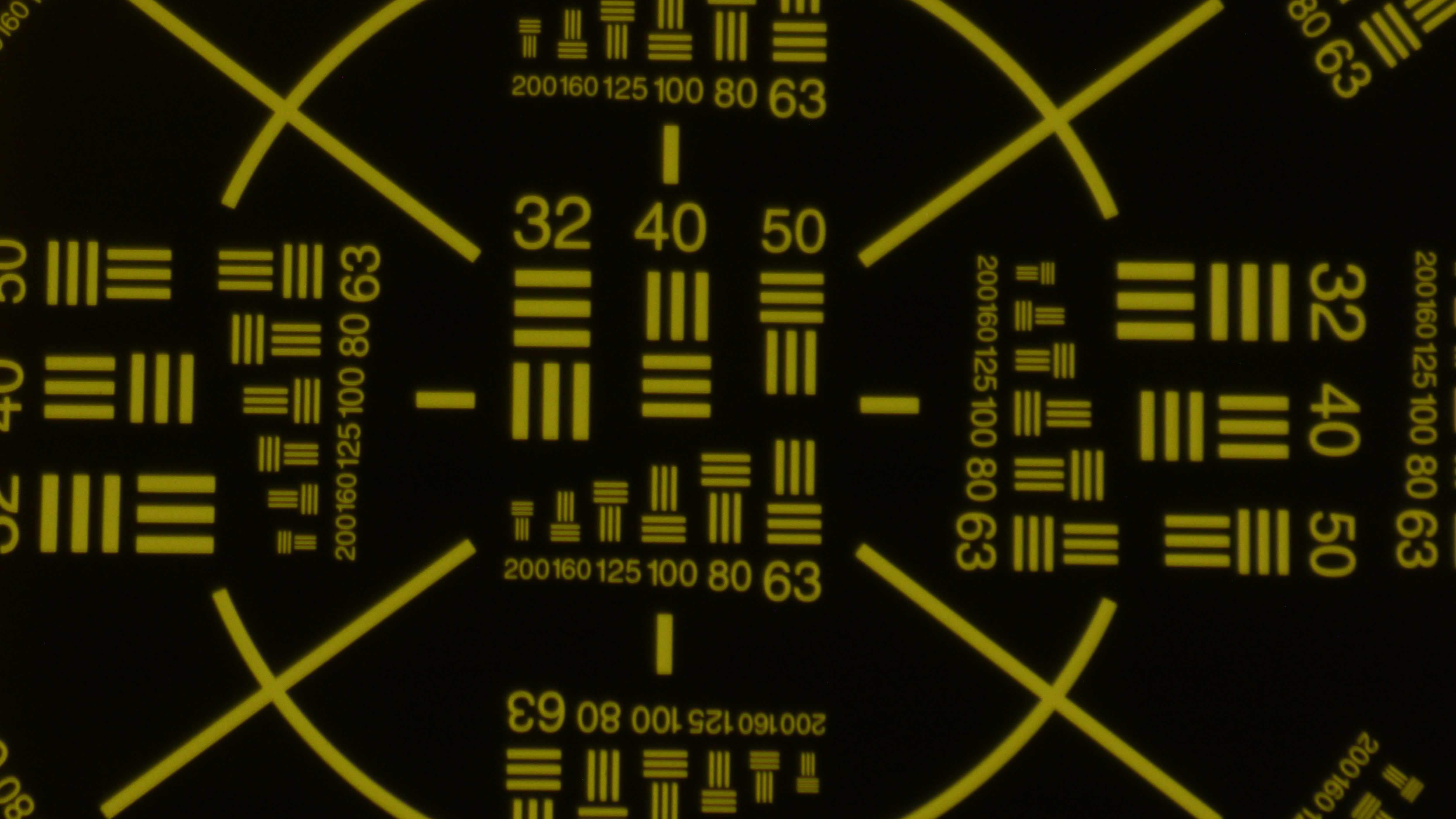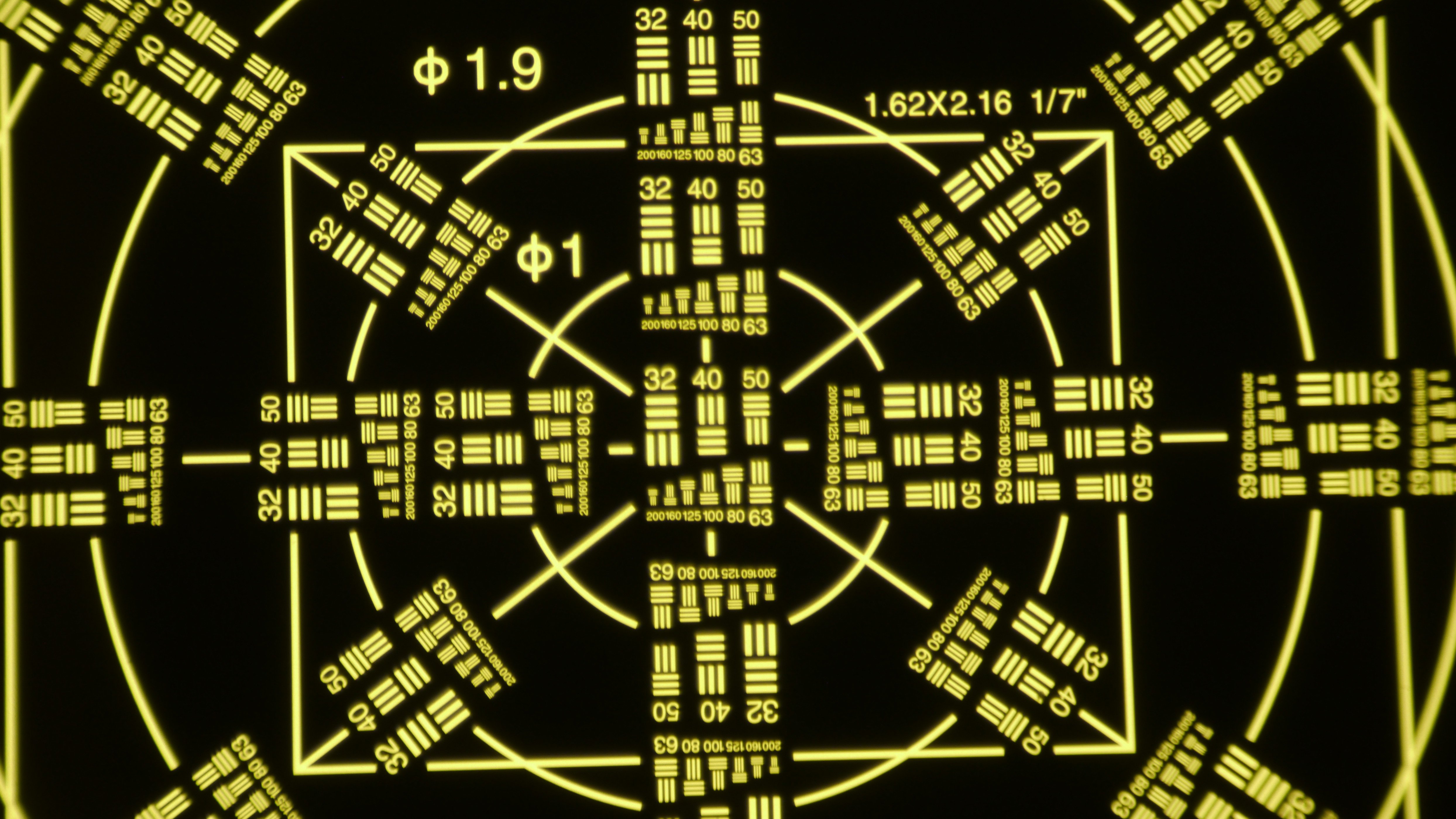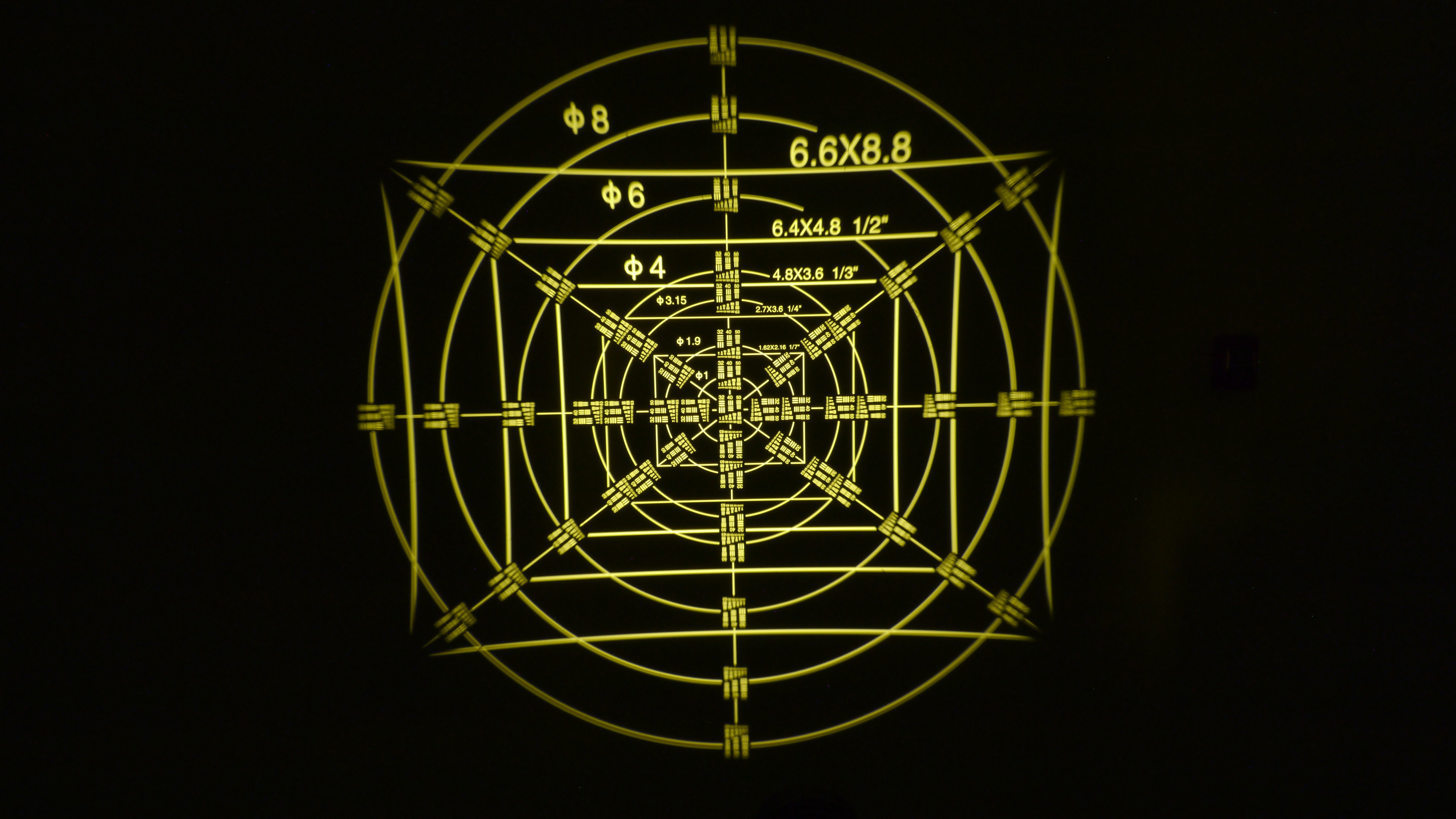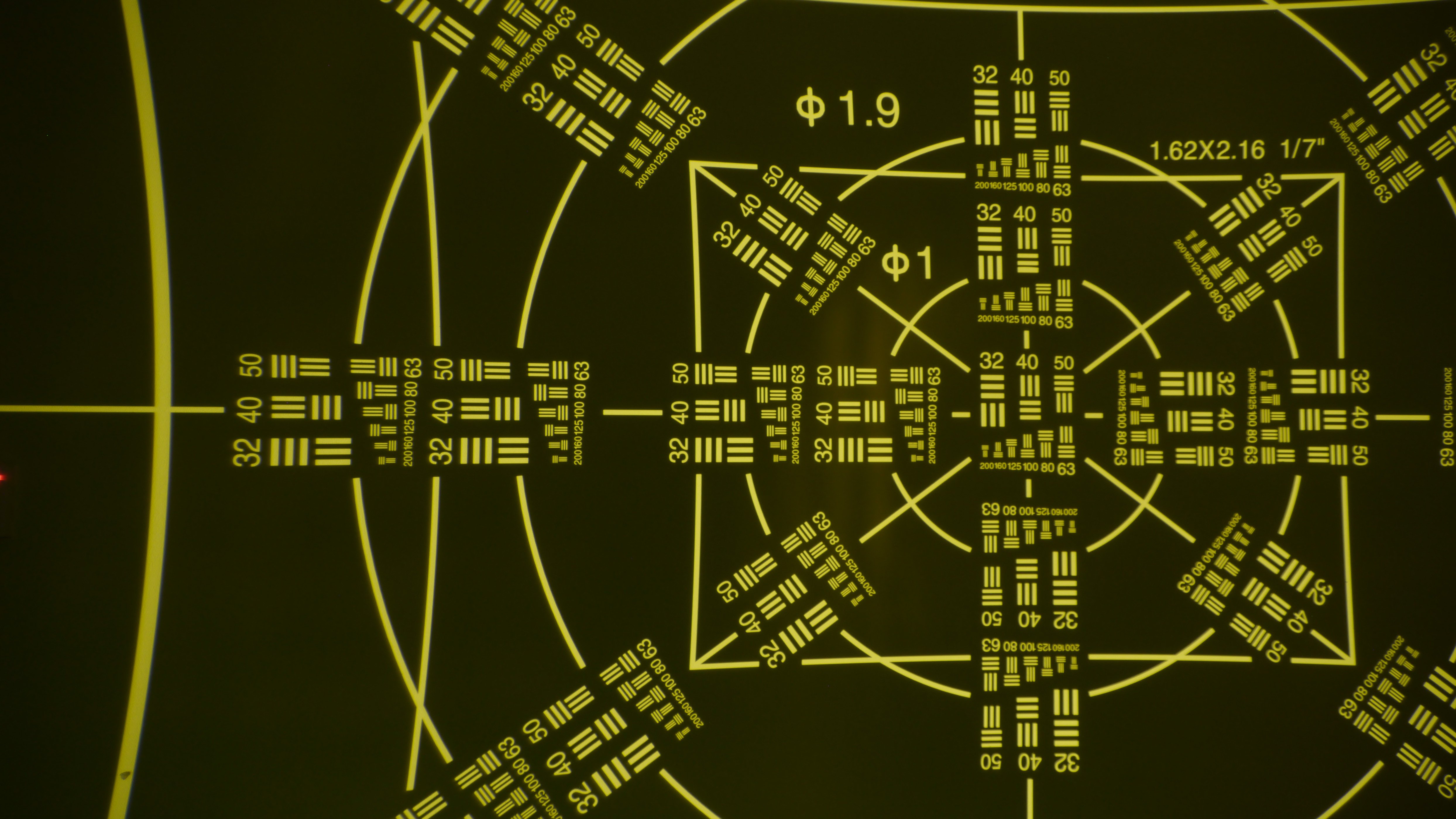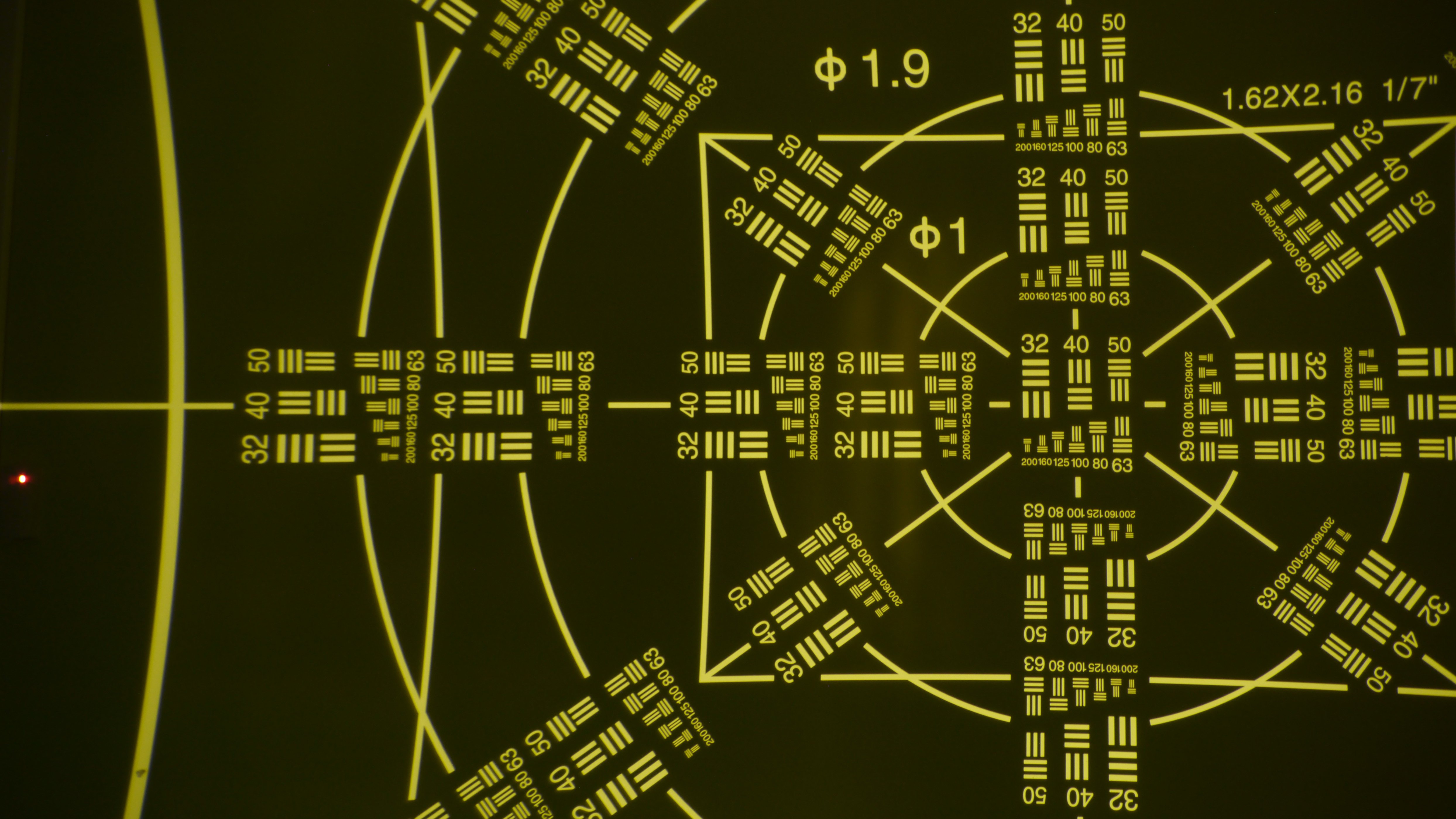 Разрешающая способность проектора составляет 200 Ip/mm (линий на миллиметр), таким образом на данном проекторе возможно протестировать объективы с максимальной разрешающей способностью до 44,23 мегапикселя для объективов рассчитанных на матрицы до 1 дюйма. Принцип его действия прост: объектив устанавливается через необходимый переходник (кольцо), подключается любая видеокамера с закрытым сенсором, если необходимо управление диафрагмой (все измерения проводим при максимально открытой диафрагме). Прибор проецирует таблицу через объектив на экран испытательную таблицу. Фокусировка и изменение фокусного расстояния производится так же, как обычно это делается на камере. Таблица имеет распределенные по полю линии разного размера и расстояния между ними с помощью которых и производится измерение разрешающей способности, которая вычисляется по формуле P=4D²*L*W, где P – количество пикселей, D — максимально-различимое число линий, L- ширина сенсора, W - высота сенсора. Размер матрицы мы берем из заявленных поставщиком данных, впрочем это легко проверяется по таблице, по которой, кроме этих двух параметров (разрешение и размер сенсора), можно еще замерить геометрические искажения вносимые оптикой и аберрации.