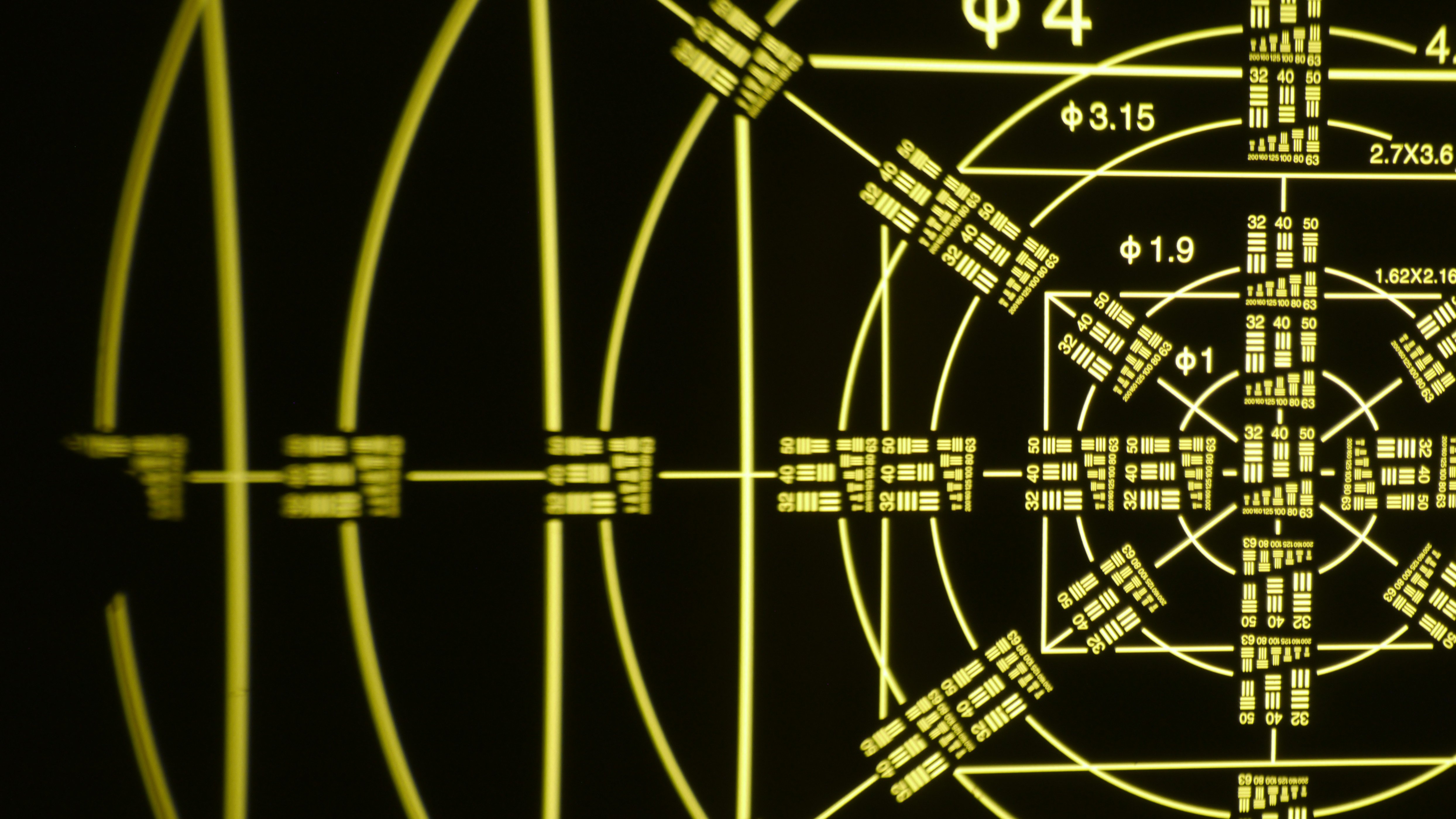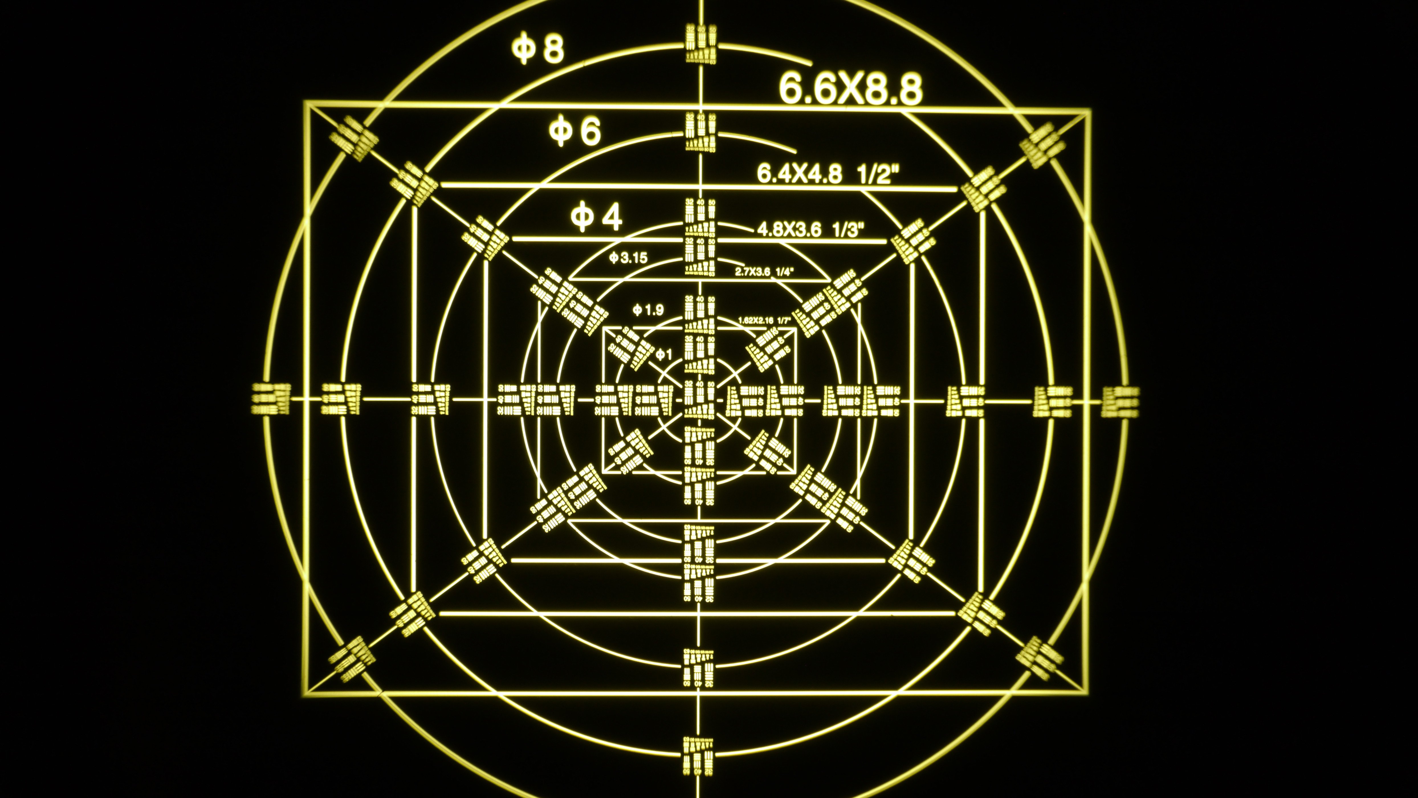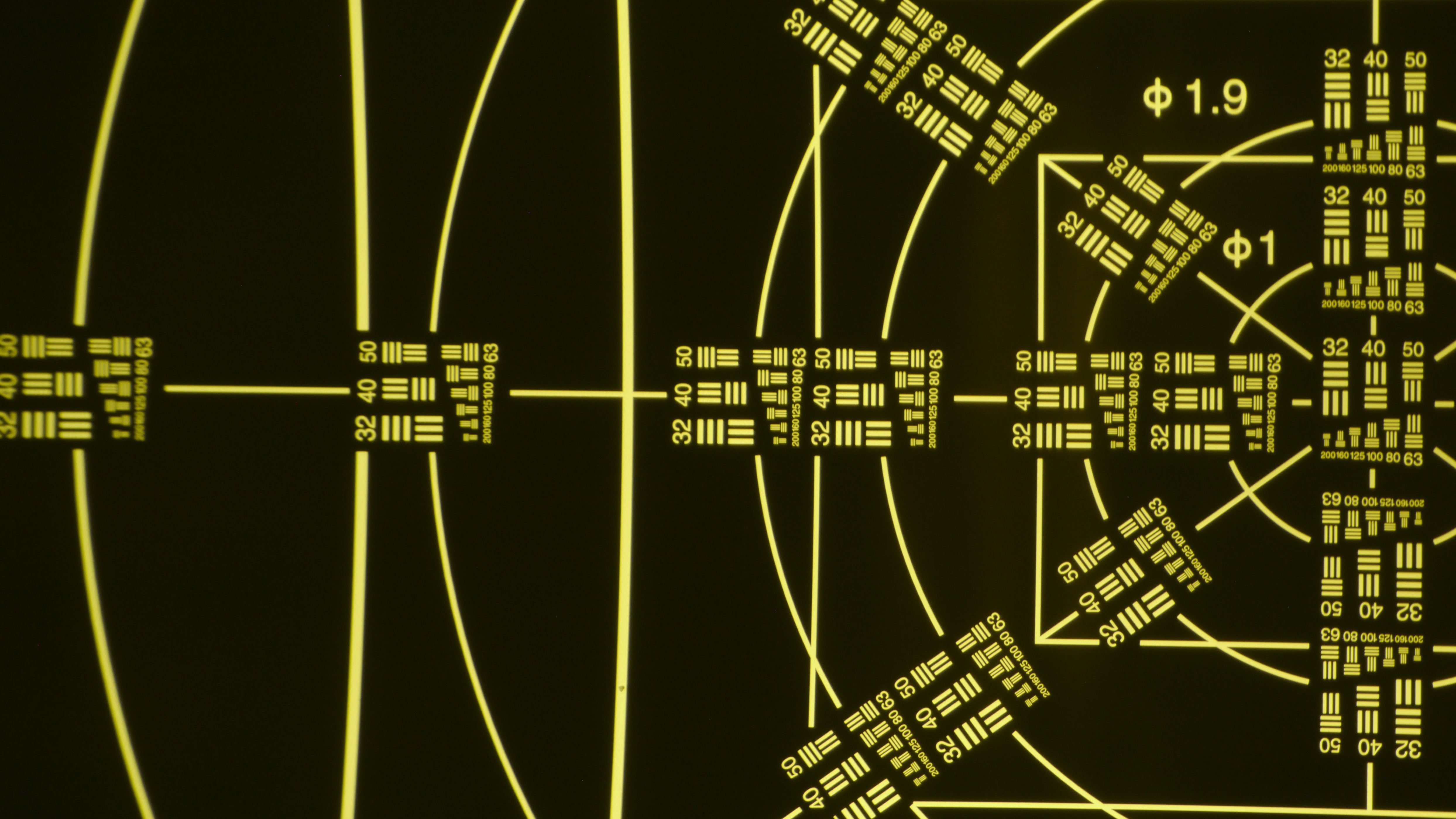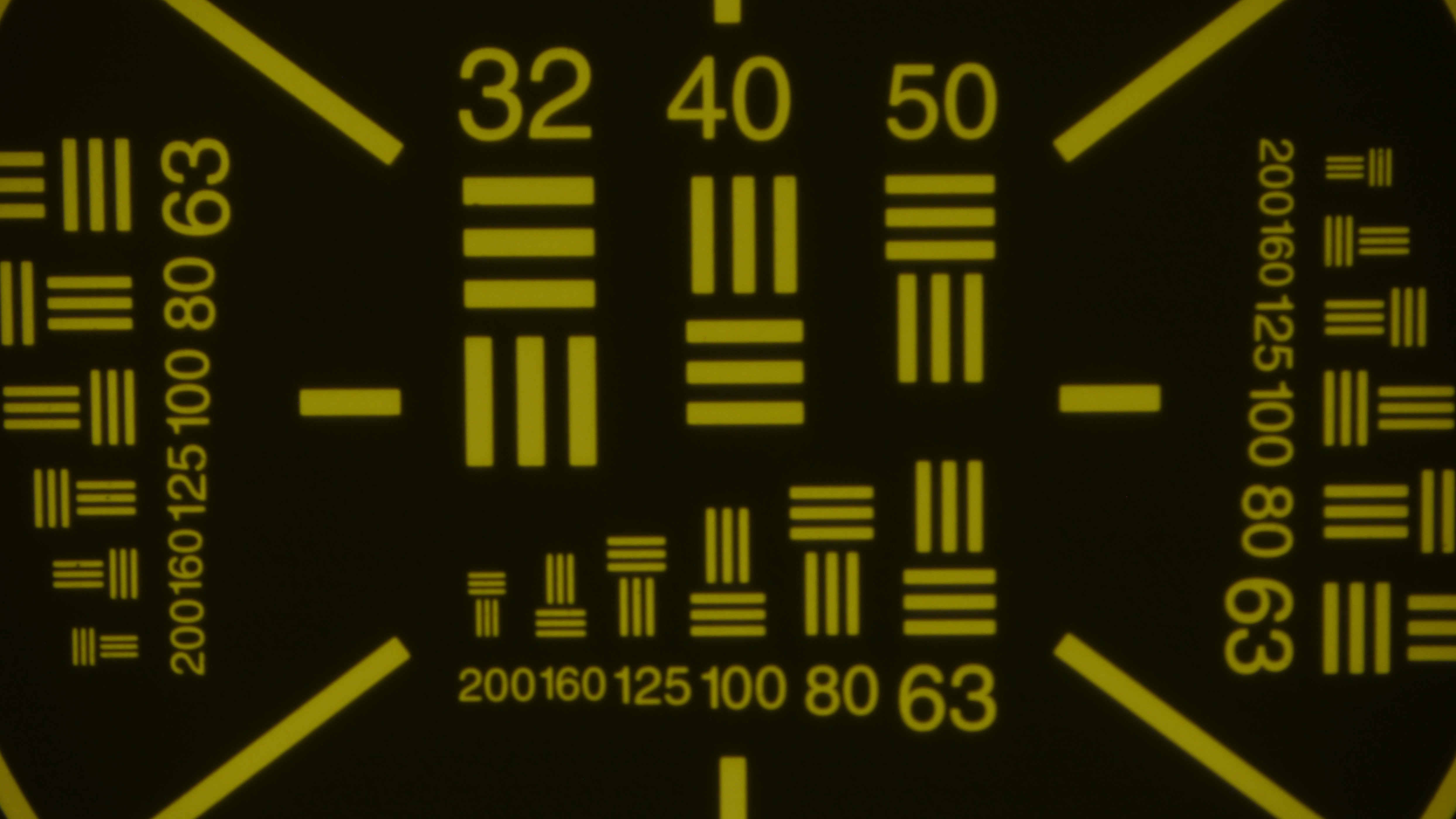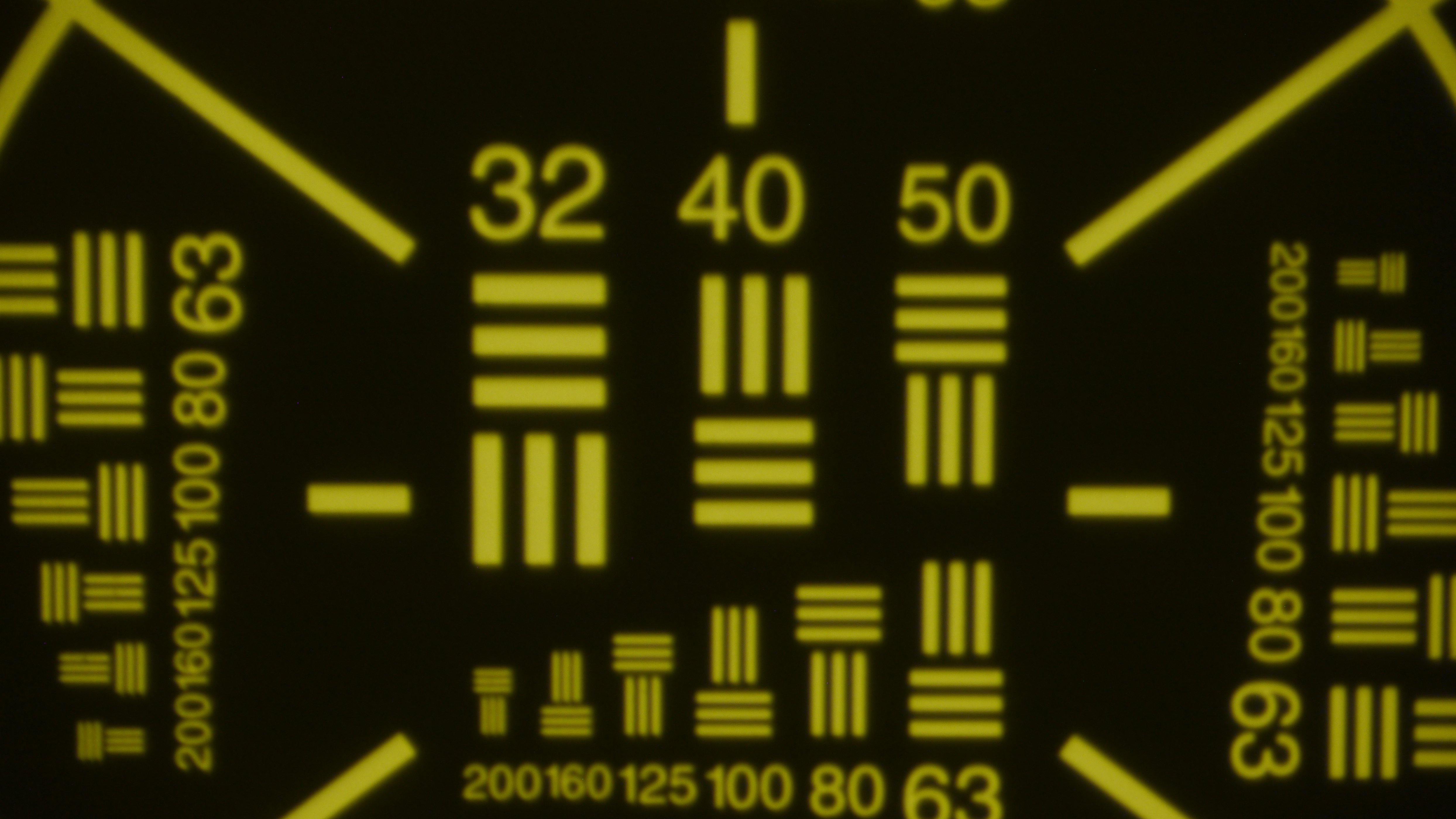Разрешающая способность проектора составляет 200 Ip/mm (линий на миллиметр), таким образом на данном проекторе возможно протестировать объективы с максимальной разрешающей способностью до 44,23 мегапикселя для объективов рассчитанных на матрицы до 1 дюйма. Принцип его действия прост: объектив устанавливается через необходимый переходник (кольцо), подключается любая видеокамера с закрытым сенсором, если необходимо управление диафрагмой (все измерения проводим при максимально открытой диафрагме). Прибор проецирует таблицу через объектив на экран испытательную таблицу. Фокусировка и изменение фокусного расстояния производится так же, как обычно это делается на камере. Таблица имеет распределенные по полю линии разного размера и расстояния между ними с помощью которых и производится измерение разрешающей способности, которая вычисляется по формуле P=4D²*L*W, где P – количество пикселей, D — максимально-различимое число линий, L- ширина сенсора, W - высота сенсора. Размер матрицы мы берем из заявленных поставщиком данных, впрочем это легко проверяется по таблице, по которой, кроме этих двух параметров (разрешение и размер сенсора), можно еще замерить геометрические искажения вносимые оптикой и аберрации.